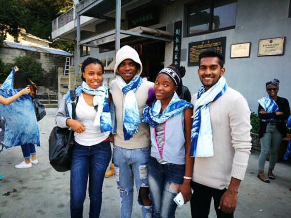 吃过午饭,所有人都有机会亲手做一条围巾,每个人把一条2米长的白布放在水里先打湿,然后对折两次用一根竹竿把布卷在竹竿上,用橡皮筋固定好放入染缸中,每次3到4分钟,需要4到5次,染过颜色之后放在太阳下晾晒2分钟,再把布拿下来放入水中清洗一下,一块漂亮的染布就做成了。留学生拿着各自的战利品看着染布上的花纹不断地感慨艺术的精妙之处,还有留学生希望把自己亲手做的围巾送给自己的妈妈。