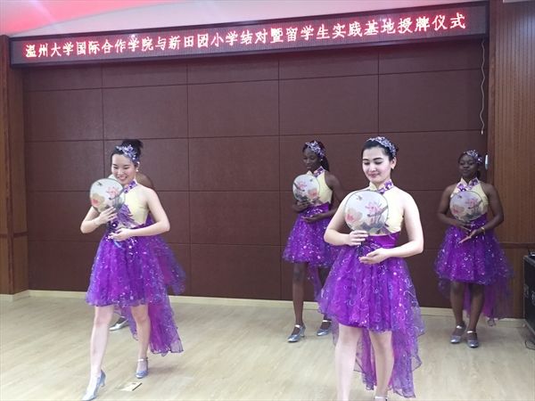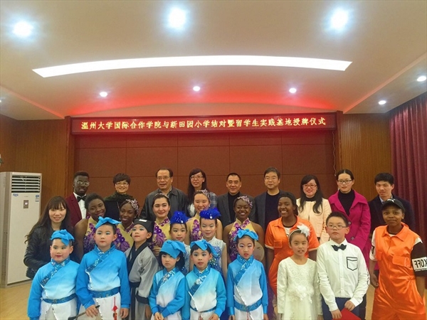 国际合作学院与新田园小学结对暨留学生实践基地授牌仪式”,并同新田园小学的师生一起表演欣赏了富有中国文化特色的节目,为两校进一步开展国际理解教育奠定了合作基础。