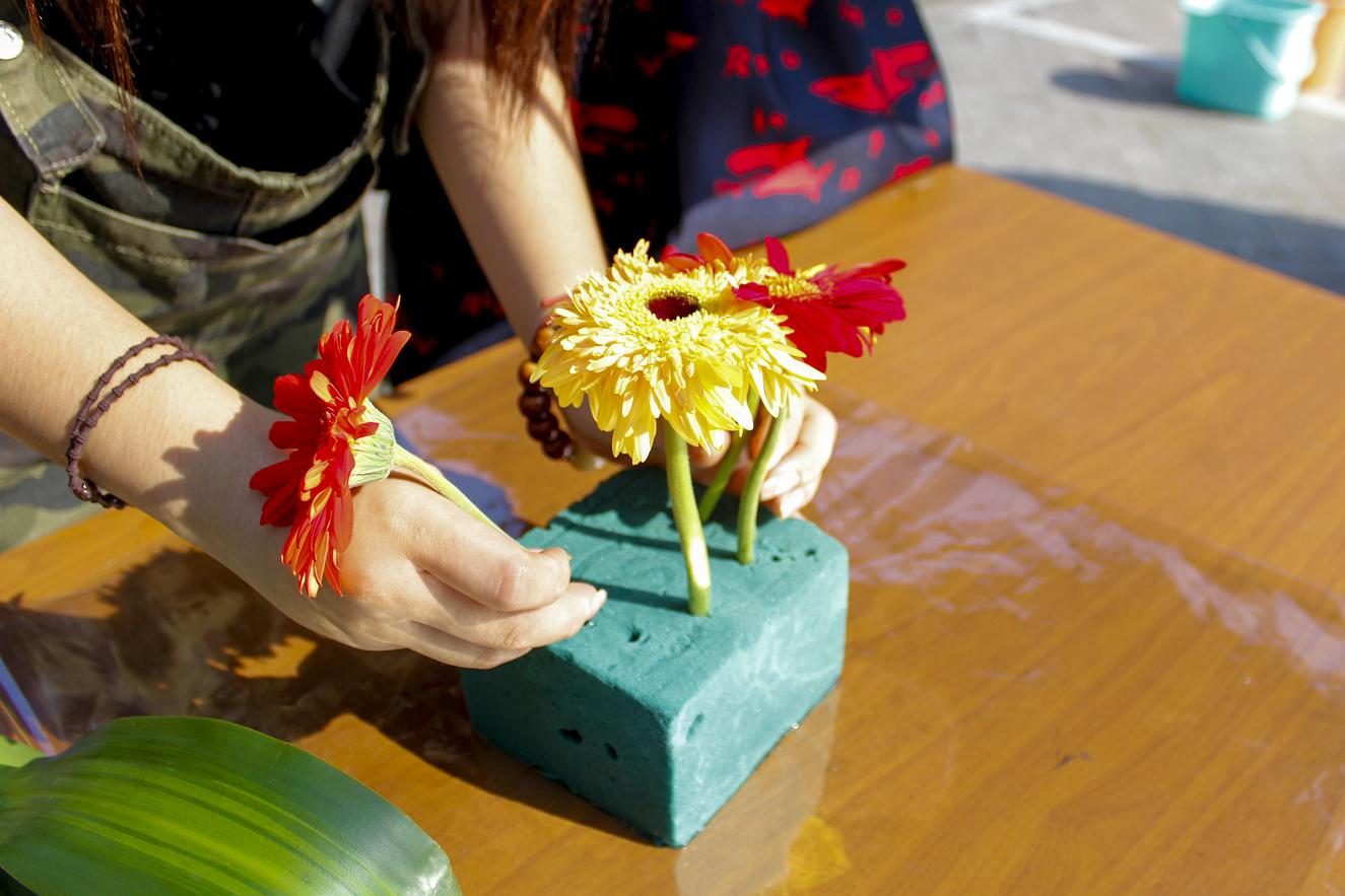 插花艺术是一门“高雅的造型艺术”,通过剪切、整理和摆插花材,留学生们愉快而耐心地修剪着一枝枝鲜嫩的玫瑰、康乃馨、勿忘我等,精心插出一捧捧美丽的盆花,在动静相宜之间,体验自我创造的快乐和巧手搭配的美感。