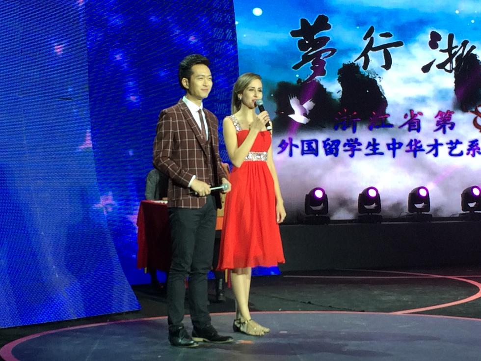 125-6日,由浙江省教育厅、浙江省人民政府外事办公室、浙江省人民政府新闻办公室、浙江广播电视集团主办的第八届“梦行浙江”外国留学生中华才艺展演在浙江师范大学举行。省教育厅副厅长于永明、省外事侨务办副主任顾建新、省政府新闻办副主任杨荣耀等出席活动。该活动是浙江省内层次最高的留学生文艺汇演活动,经过层层选拔,15所高校近200名来自世界各地的留学生齐聚在此,用歌曲、舞蹈、舞台剧等丰富多彩的方式演绎他们眼中的中国风和浙江情,表达他们对中国及中国文化的热爱之情。活动的主持人由我校俄罗斯籍学生喀秋莎担任,她在不久前举行的“梦行浙江”外国留学生主持人选拔赛里,从百名参赛者中脱颖而出,被选为本次展演活动的4名留学生主持人之一。
