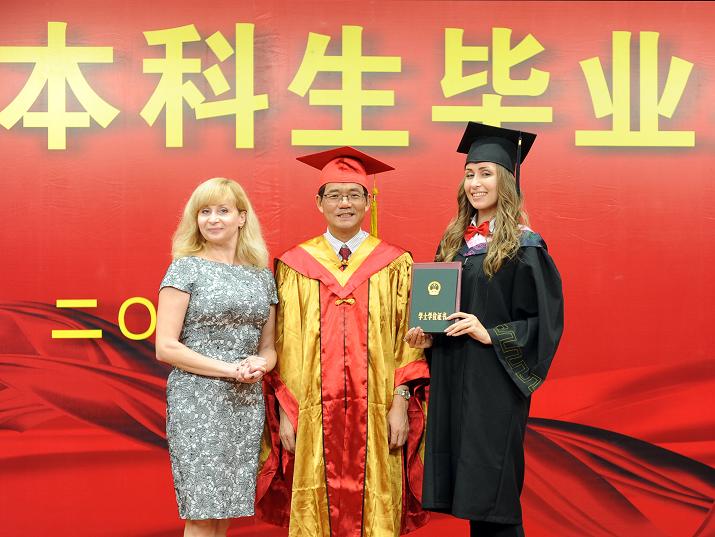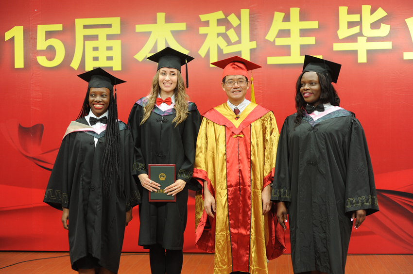 优秀留学生毕业生喀秋莎、胡瑜瑜同学,国际合作学院优秀留学生毕业Jentha和Devotha颁奖,副院长包含丽为喀秋莎颁发了“2015届毕业生校友联络员”证书,希望她能积极推动我校留学生校友工作的不断发展。