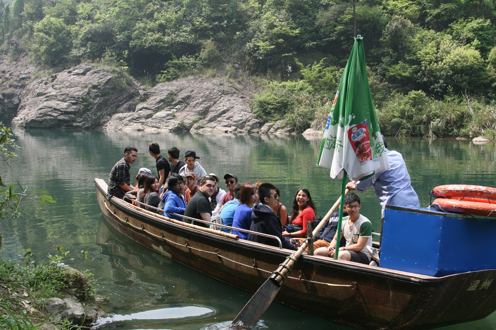 临近傍晚,他们来到了本次探访的最后一站——楠溪江漂流。七人一组,按顺序坐到了竹筏上,穿上救生衣后,开始了漂流之旅。看着青山绿水,听着船夫唱起山歌,留学生们情不自禁地跟着哼唱,合拍,鼓掌。清澈的溪水,动听的山歌,脱离了城市喧嚣,让外国留学生们尽情地享受了一回。