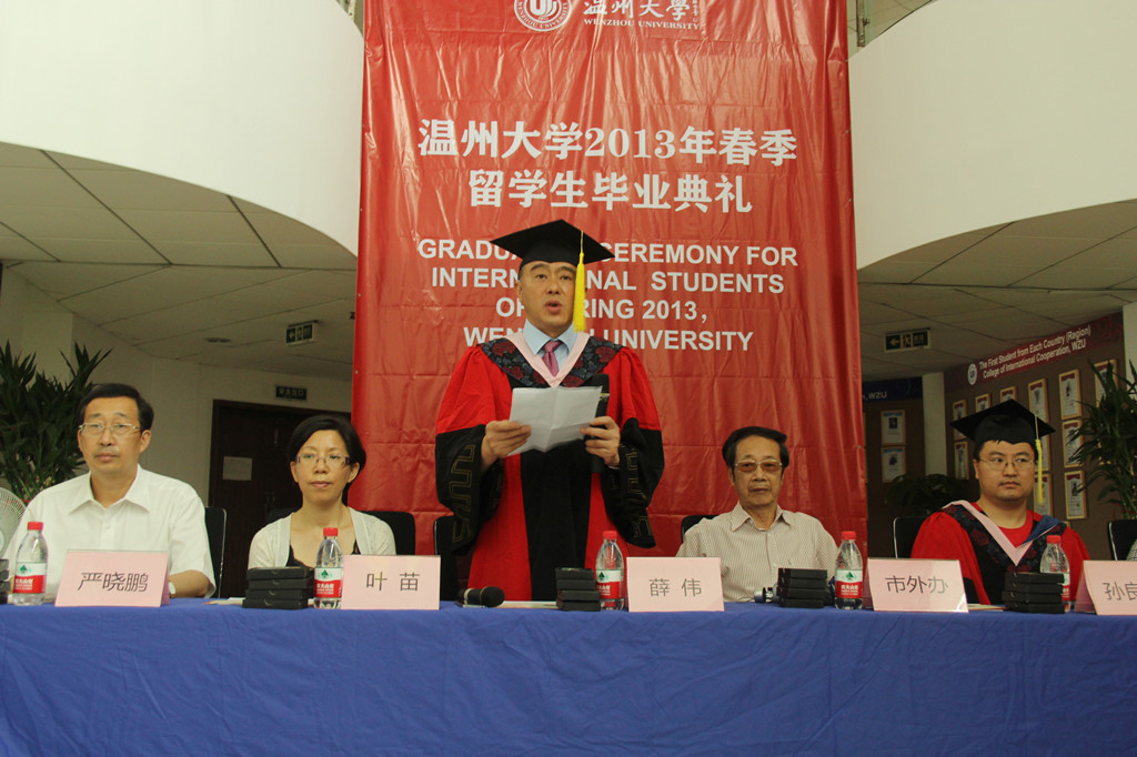 专家楼三楼大厅举行。副校长薛伟,原温州市外事办主任孙小钏、外事处处长叶苗,人文学院副院长孙良好,国际合作学院党总支书记朱建平出席,参加典礼的还有来自日本的硕士研究生,来自美国的亚洲研究项目交换生,以及来自西班牙、不丹、刚果、南非、加纳等国家的语言班学生。典礼由国际合作学院院长严晓鹏主持。
