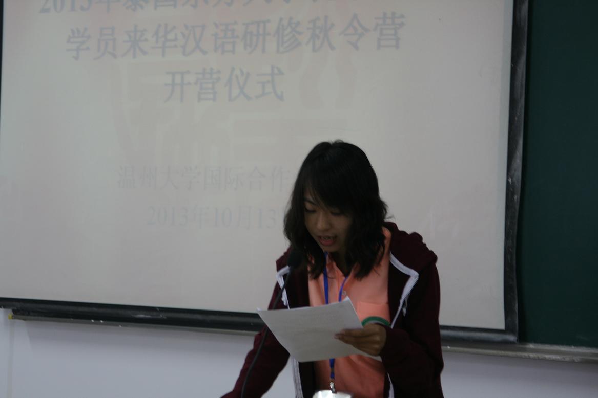 2013年10月14日上午9点,泰国东方大学孔子学院学员来华汉语研修秋令营在南校区9号楼准时开营。国际合作学院院长严晓鹏博士、东方大学孔子学院中方院长陈素云老师出席此次开营仪式,国际合作学院的教师代表以及20位营员共同参加了此次开营仪式。仪式由学院汉语推广教研室主任郑婷主持。