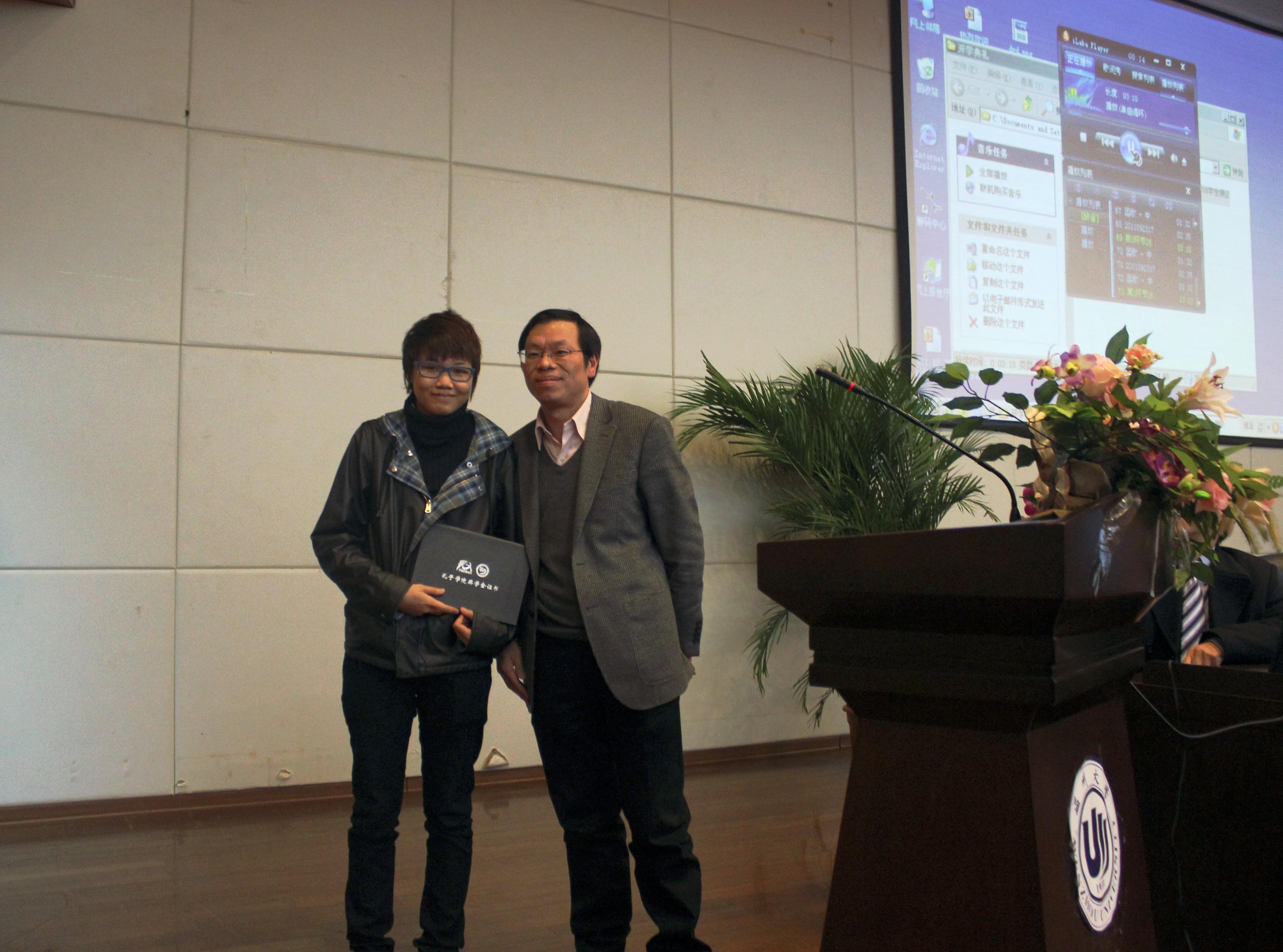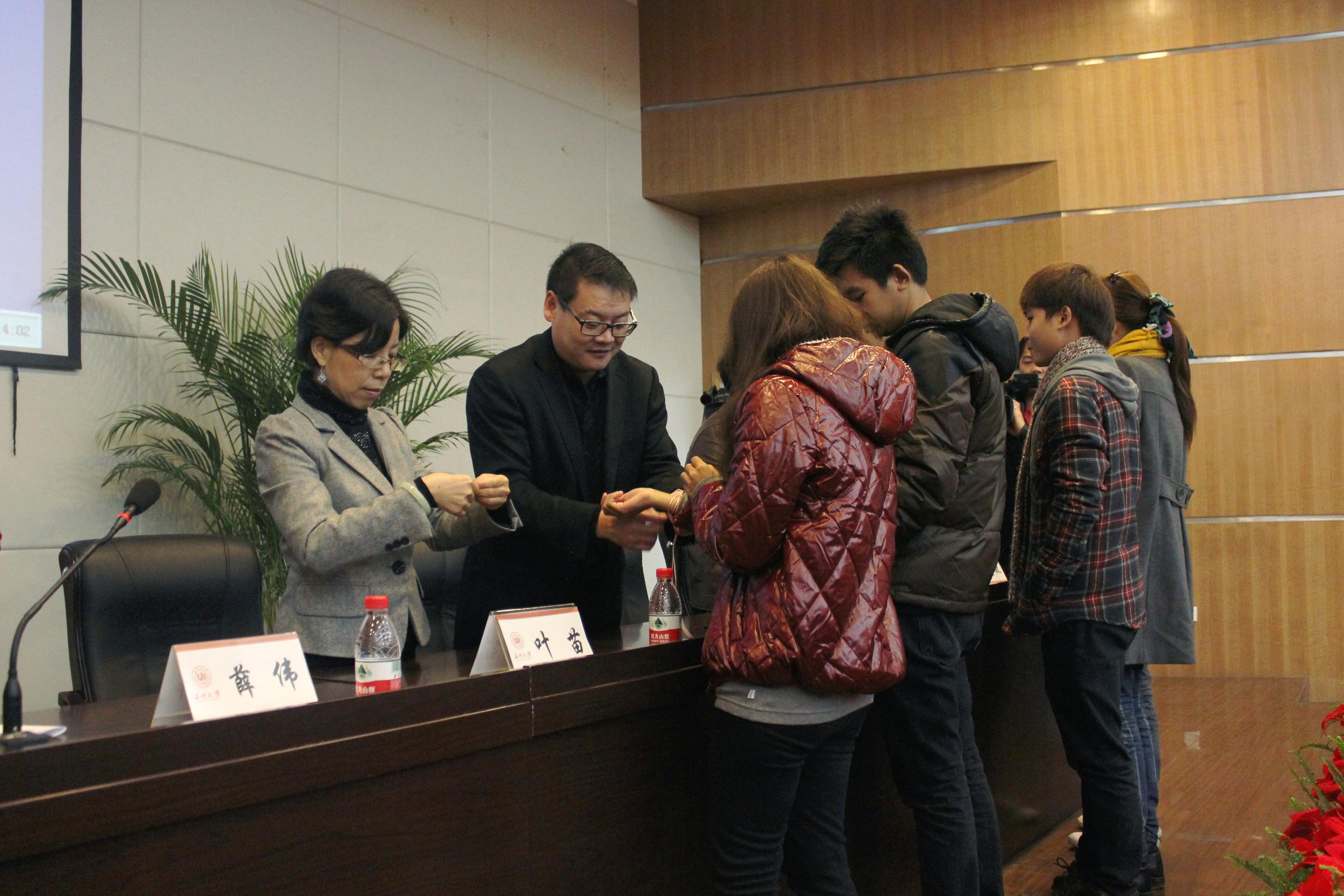 的发展情况以及学校的留学生教育工作,并希望同学们珍惜学习机会,学有所成,为中外友谊和交流贡献力量。叶世祥副校长宣读2011年度孔子学院奖学金获得者名单并为获得奖学金的留学生们颁发了证书。教师代表、来自泰国的留学生代表分别发言。典礼上,主席台嘉宾还为新生代表佩戴校徽并系上寓意祝福的彩色丝带。