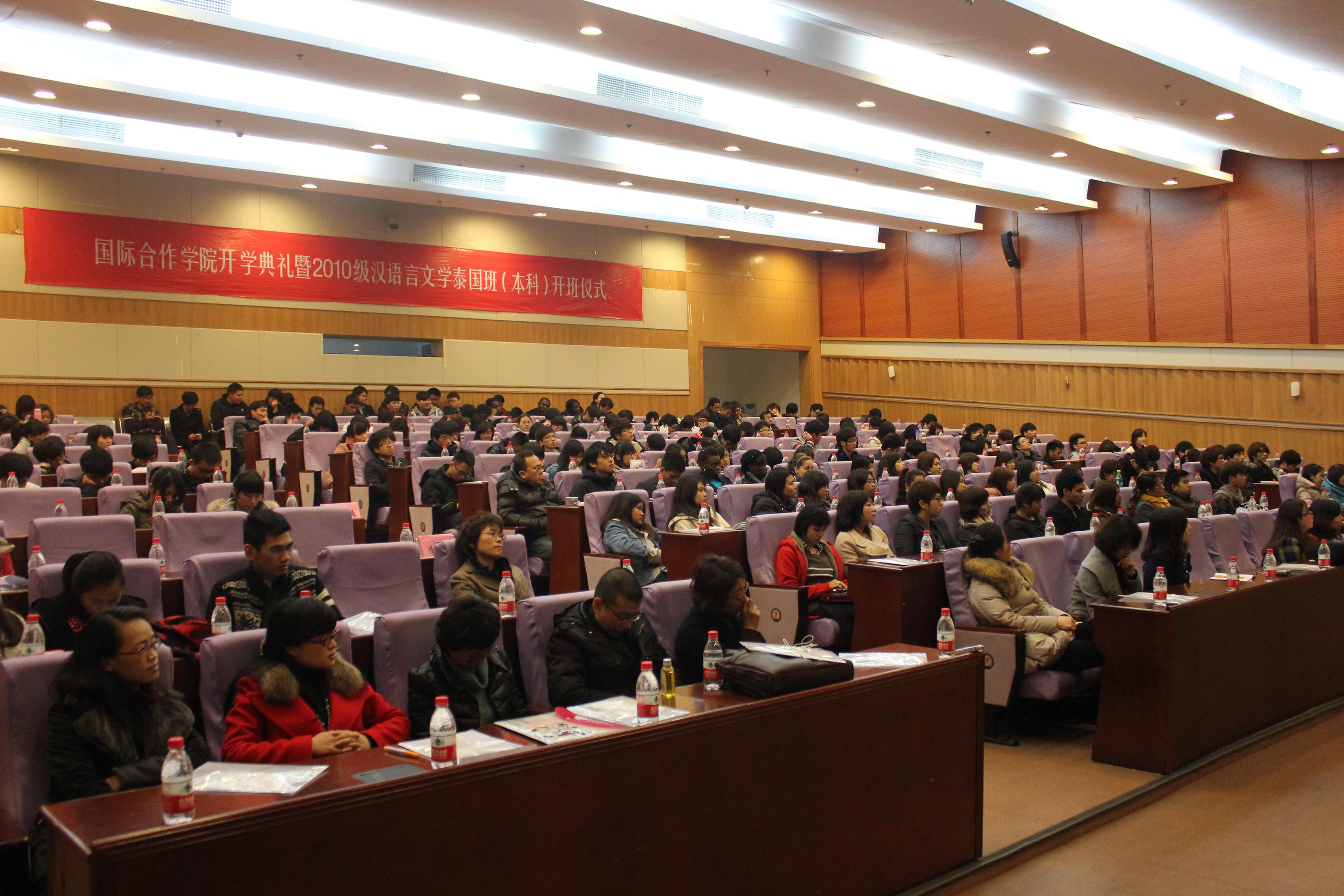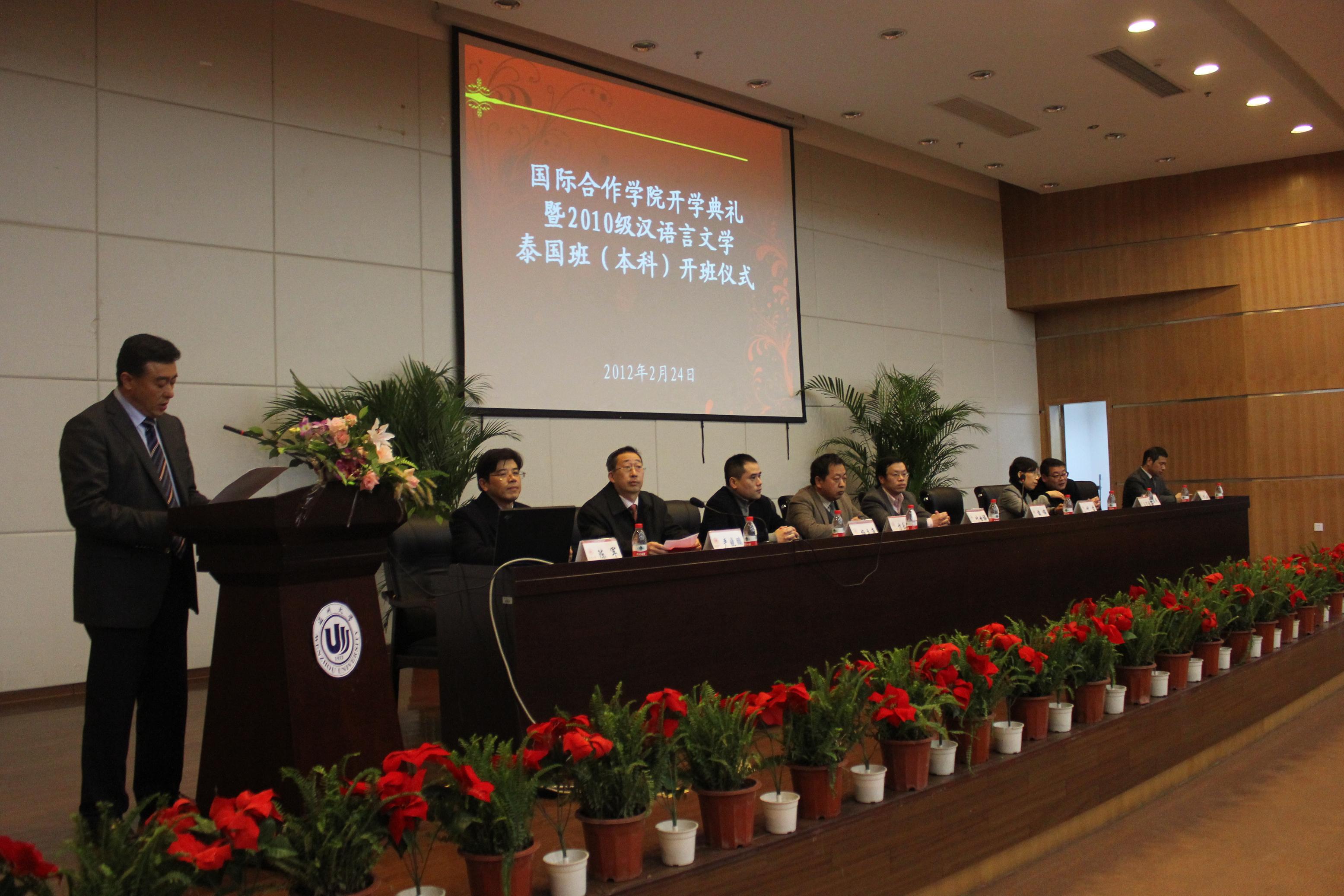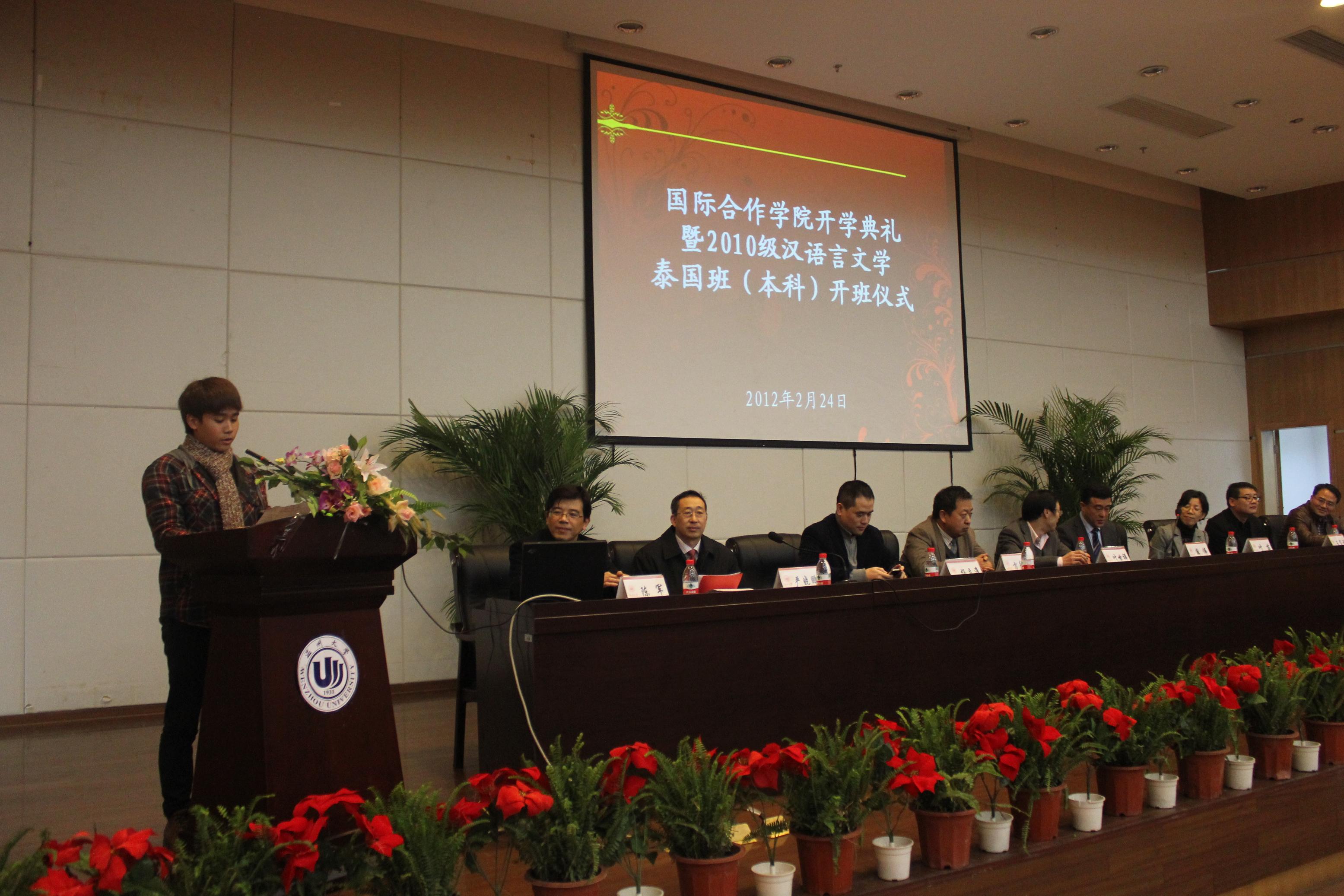 开学典礼暨2010级汉语言文学泰国班(本科)开班仪式在图书馆报告厅隆重举行。副校长薛伟、叶世祥,外事处、教务处、学生处、团委、校友联络办公室、人文学院等相关部门和学院负责人出席典礼。