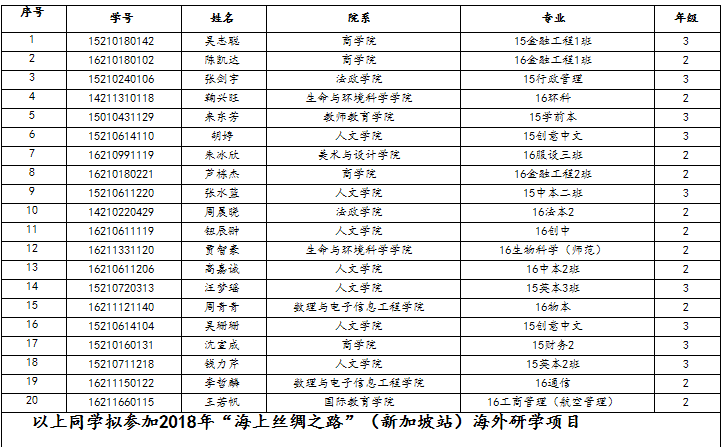 2018年“海上丝绸之路”(新加坡站)海外研学项目,现对学生面试排名予以公示,如有同学因特殊原因无法如期参加,且可以办理相关替换手续的,按面试排序依次补足。