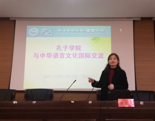 4月15日下午,海角视频 国际汉语教师张丽丽副教授,应平阳县教师发展中心邀请,以《孔子学院与中华语言文化国际交流》为题,为平阳县中小学“国学智慧”培训班作了一场别开生面的讲座。
