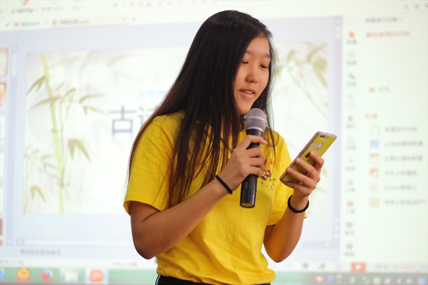 诗词是中文独有的一种文体,有特殊的格式及韵律。在了解一定的中华古诗词历史后,华老师开始教大家如何朗读古诗词,注意平仄,投入感情。课程的后半段,老师带领着营员们开了一个小型的诗词朗诵会,从《静夜思》到《望庐山瀑布》,再到《赋得古原草送别》,营员们积极踊跃地上台朗诵。后来,徐悦诗、张蓓蕾和郑慧琳三位营员还为大家吟唱了苏轼的《水调歌头》,曲调婉转,歌声悠扬,赢得热烈的掌声。最后,营员刘恋恋还与大家分享了一首她自己的诗,对能跟大家在一起表示感谢。