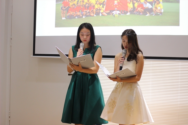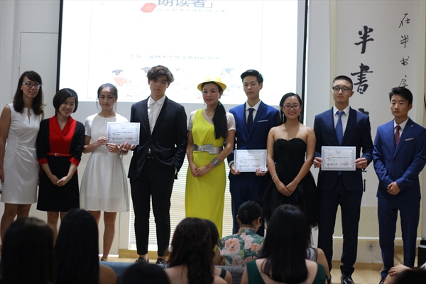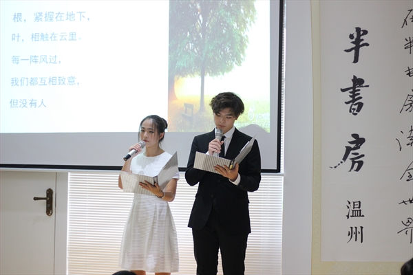 主持人包含丽老师先为大家介绍了今天到场的嘉宾:外侨办文宣处处长刘时敏、温州电视台主播梓姚女士和著名礼仪指导师傅玲丹女士。此次朗读者大会分为三个模块:爱与感恩、梦想与未来及游子的中国心。