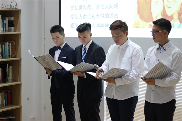 而后,朗读者程杰克、叶苏赟、鲁班温、叶俊杉在热烈的掌声中走上舞台,为大家带来诗朗诵《爱》。四位男生在与主持人包老师的聊天中说到他们之所以选择这篇作品来朗诵,是希望大家能明白爱就在我们身边,要学会感受爱、珍惜爱。听完他们的深情朗诵,大家体会到了亲情之爱、友情之爱。