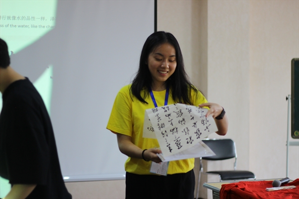 8月7日下午,2017年“中国寻根之旅”夏令营特地邀请浙江省女书法家协会会员程苗苗老师来给营员们上了一堂别开生面的书法课。