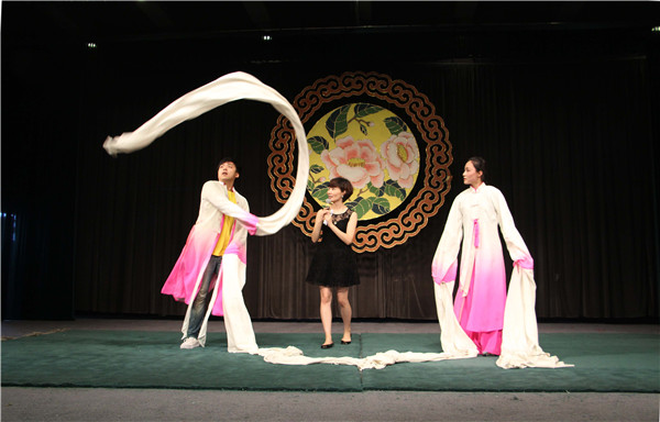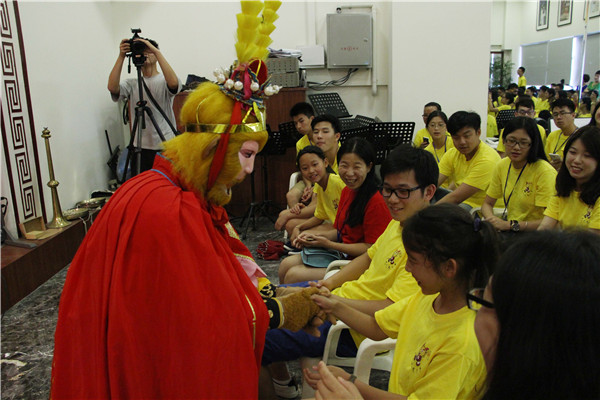 在瓯剧艺术研究院的精心安排下,整个活动既注重互动性、娱乐性又体现知识性,专业性。优美的水袖表演后,主持人向营员们介绍了瓯剧的历史和戏曲的基本知识,为了让这群“香蕉人”身临其境地体验瓯剧表演,主持人邀请华裔青年们走上舞台现场学习水袖舞、耍花枪的动作,营员们兴致勃勃,学得有模有样。接着营员们享受了一场瓯剧的饕餮盛宴,整场演出精彩纷呈,气氛热烈:幽默的佛珠功加上滑稽、夸张的丑角扮相让台下笑声不断;《扈家庄》“扈三娘”英姿煞爽,引来一片叫好声;《酒楼沙场》武技精湛,悠扬的民乐演奏让同学们陶醉其中,猴戏《齐天大圣孙悟空》更是将气氛推向了高潮。表演观看结束后,华裔青年们纷纷走上舞台向瓯剧演员们讨教动作要领,学得不亦乐乎。