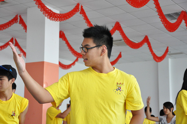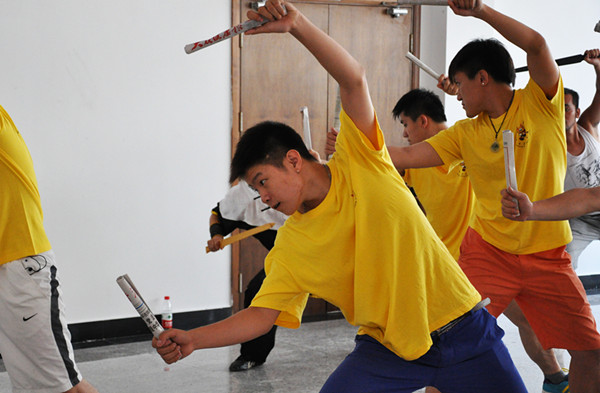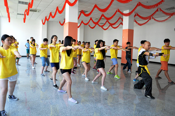 木老师首先为营员们简要介绍了中国武术的历史和概况,以及目前的武术流派,并为营员们表演了一段五祖拳。木老师刚柔并济、虎虎生威的一招一式,看得营员们不时发出惊叹喝彩声,并且跃跃欲试。随后,木老师为大家演示了一组基础的拳法,每一个动作都拆解开来进行详细的讲解,并一遍遍耐心地为营员们作示范。营员们虽然练得汗流浃背,但是都专心致志,兴致勃勃,一招一式力求到位。
