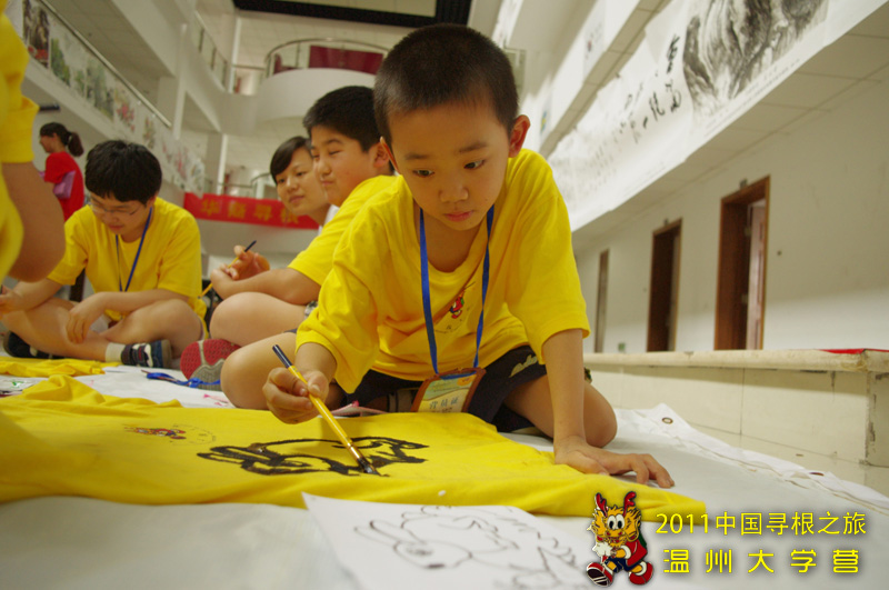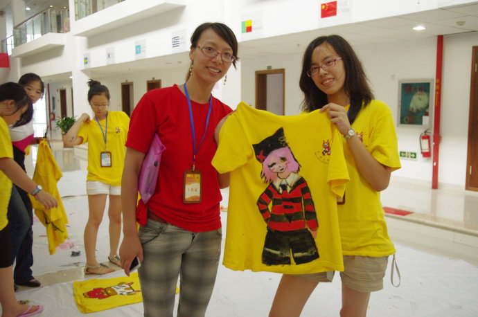 到了实践环节,营员们迫不及待地拿出自己的营服铺在地上,有的画了卡通兔子,有的画了中国娃娃,有的画了浴火重生的凤凰,还有的画了可爱的小猪或是海绵宝宝。大家拿起画笔,涂上颜料,一笔一画,尽情地在自己的“画纸”上创作着,充分发挥了自己的想象力和动手能力。最后,营员们完成好自己的作品后,纷纷留影纪念,并表示这是一次令人快乐难忘的经历。
