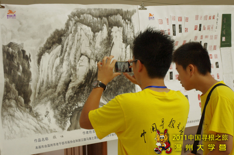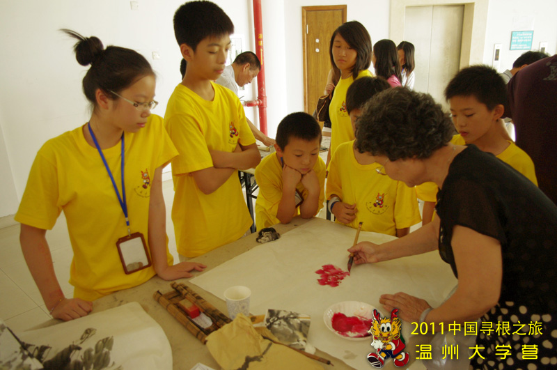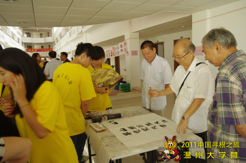 7月22日上午,温州市老年书法协会30多名退休老干部来到2011海外华裔青少年“中国寻根之旅”夏令营温州营温大分营的营地,对海外华裔青少年们进行书画展览和现场书画创作展示,让营员们感受到中国传统书画艺术的魅力。到场的除了营地85名海外华裔青少年,还有20多名海外华校教师培训班的学员们。