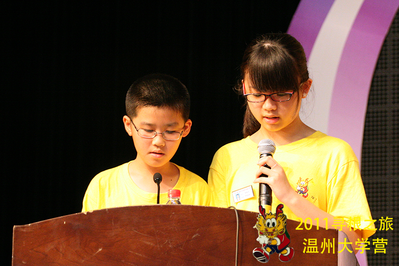领导欢迎营员们的到来,然后有来自意大利的华裔杨益佳和程明锦小朋友代表夏令营小营员们发言,在发言中,稚嫩的童音却铿锵有力地说道:“以前,他们叫我们为香蕉人,说我们‘外黄内白’,虽然长得和普通中国人一样,不过内心已被西化。现在,我们希望大家叫我们‘菠萝人’,因为我们从内到外都是地地道道的中国人!”小营员们的发言得到了在座所有海外华裔青少年们的强烈认可和共鸣,赢得在场所有人员最热烈的掌声。