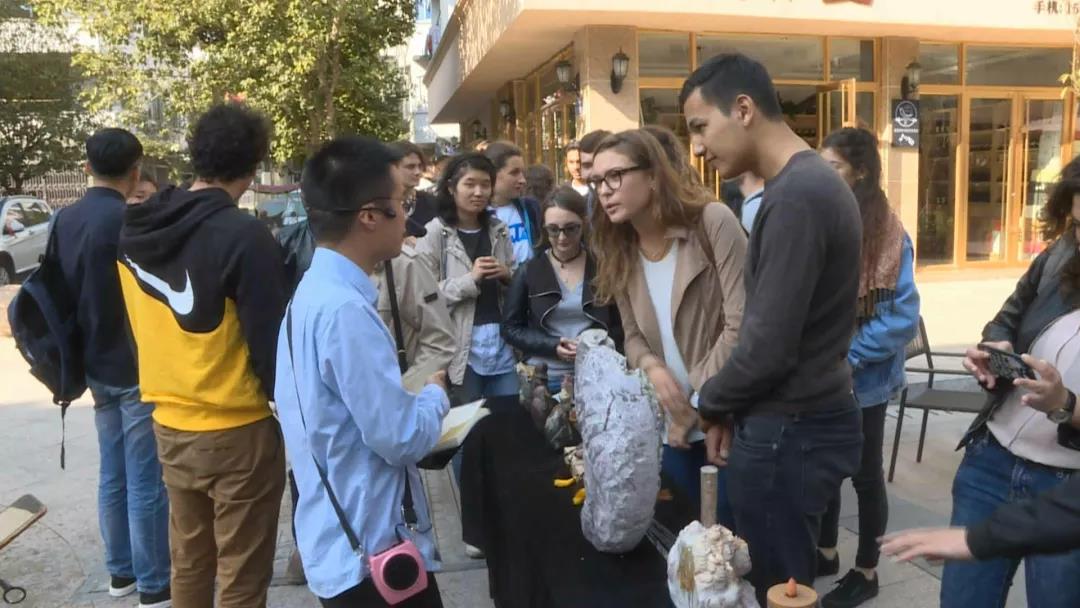 在海外人才创业示范街石雕艺术展示现场,玉壶镇邀请了意大利华侨石雕艺术家胡植柱、胡慧溪两兄弟,为国际生上了一节独具特色的体验课。