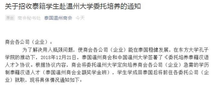 与泰国温州商会“联姻”,创办了泰国温州商会全额奖学金班,首期计划招录15人,将于今年9月开班。