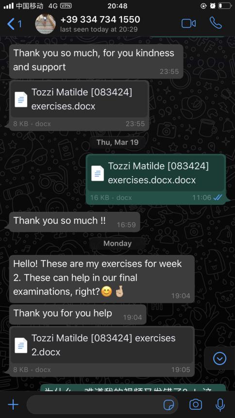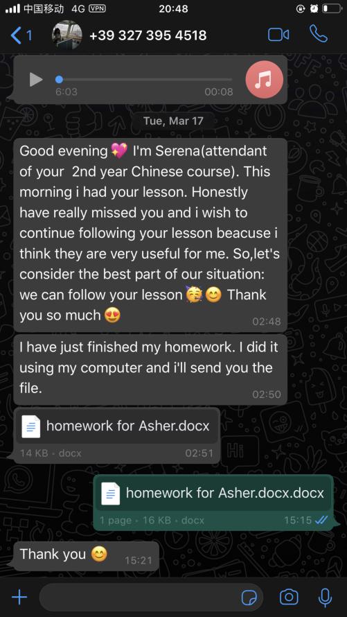 每一周,张珉璐都会精心把每个年级的两小时课程视频录制好,与音频、ppt、练习作业及一些额外的针对不同级别HSK的练习发送给意大利老师,意大利老师再上传至海角视频