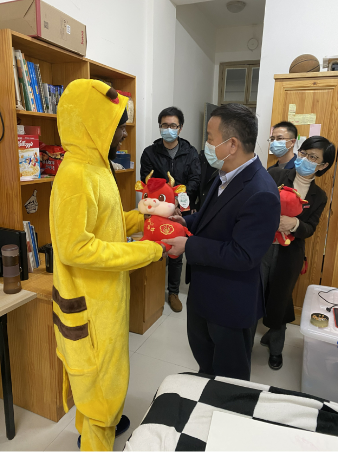 谢树华在寝室向留学生送上新年的问候和美好的祝愿,嘱咐大家要牢记和遵守疫情防控要求,保护好自身健康,利用假期时间多学习中文,学习中国文化,学习专业知识,不断充实自己。要和远在异国他乡的家人保持联系,让家人了解自己在海角视频