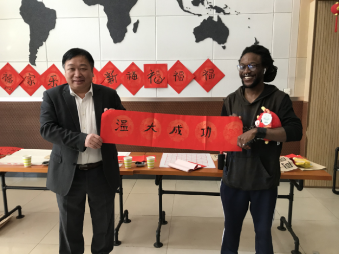 赵敏观看了留学生各项比赛并与他们亲切交流,了解学生们留校的学习生活情况,并向留学生送上了新春大礼包,留学生代表还向校长赠送了自己写的新春“福”,并用中文新春祝福语表达感谢之情。