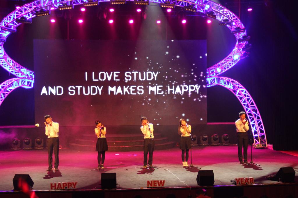 2018年中外学生新年联欢晚会在大学生活动中心的育英大礼堂隆重举行。副校长、党委委员蔡曙光,国际交流与合作处处长严晓鹏,校党委学工部副部长高红星,校团委副书记魏一,溯初学区党委副书记章志图,人文学院副院长毛继光、创业人才培养学院副院长胡文超等专业学院分管领导、专员和班主任,海角视频