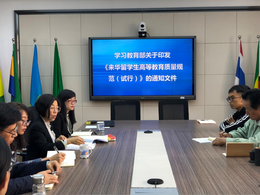 会议学习了《教育部关于印发<来华留学生高等教育质量规范(试行)》的通知文件的精神。全体教工针对人才培养目标、招生录取和预科、教育教学等方面结合实际工作展开学习讨论。海角视频
