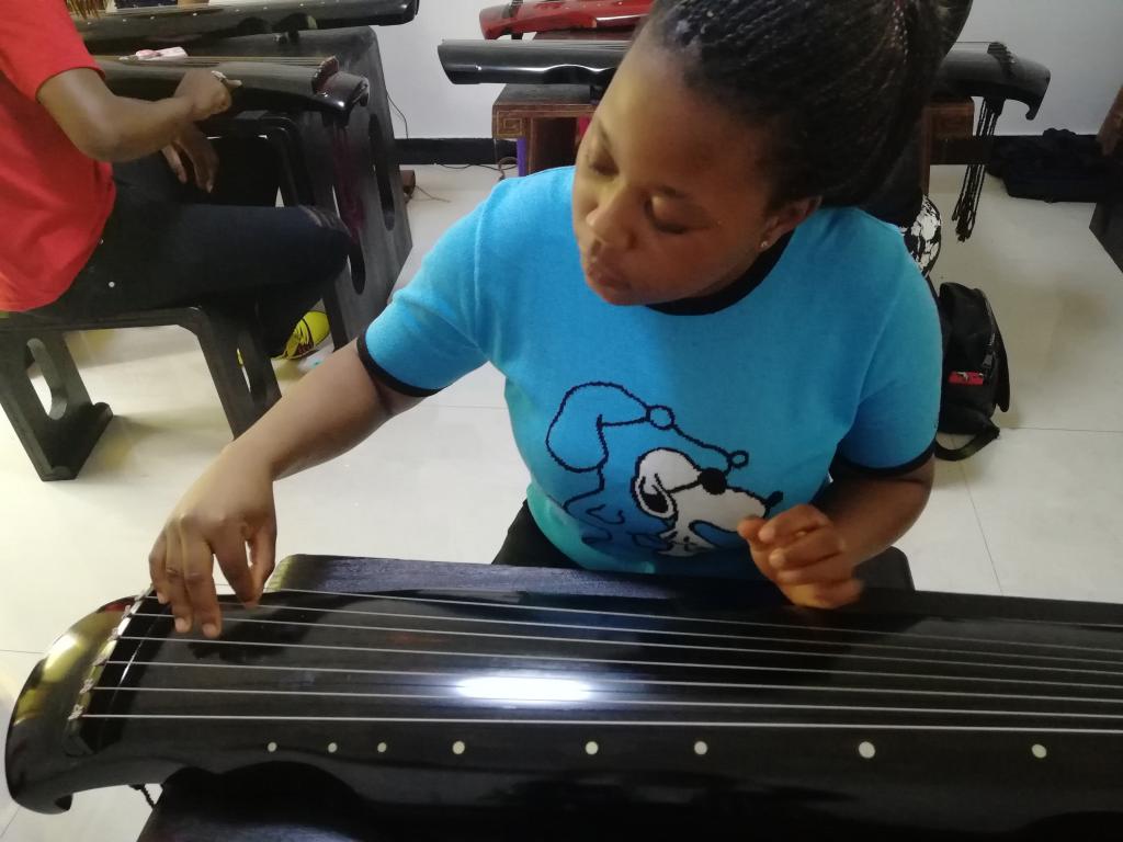 学生们按捺住激动的心,听蔡老师讲解了古琴的基本指法和演奏技巧。随后,蔡老师手把手教学生练习经典曲目《沧海一声笑》,一时间,琴声潺潺,余音悠远,此起彼伏的琴音似乎把人带到了遥远的时空。在多次尝试与反复练习后,大多数学生迅速掌握了古琴的基本指法,有两位加纳的女生还能非常流畅地弹奏了该曲目,博得同学们的阵阵掌声。