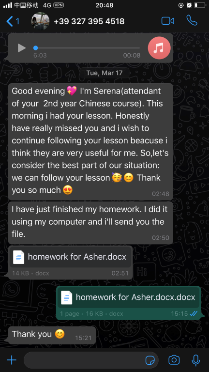 意大利分校进行汉语教学工作。今年1月外派结束返温后,张珉璐老师应分校学生的强烈要求,继续为学生开展线上课程。每周都为每个年级精心录制长达两个小时的教学视频,录完后再把这些视频还有音频、ppt、课后练习及一些额外针对不同级别的HSK练习发送给意大利老师,再由意大利老师上传至锡耶纳大学的学习平台,学生通过平台下载视频和学习资料进行学习。