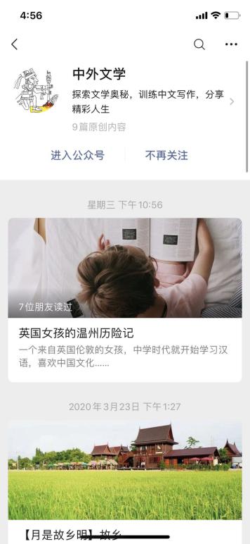 4.《中级汉语写作》与《现代短篇小说》课程任课老师易永谊,为了激发国际学生的中文写作,带领中文系学生创办“中外文学”微信公众号,让国际学生在学习中国文学的同时进行模仿创作,通过现代化的社交工具展现自己的写作成果。该公众号也刊发中国学生书写国外体验的游记,以及中国学生在其他国家留学的文章,增加各国学生的跨文化跨语言的写作分享与文化交流。