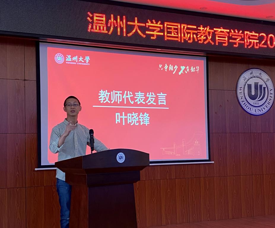 瓯江学院特聘教授叶晓锋博士作为教师代表发言,叶老师指出汉语国际教育专业学生不仅要有扎实的专业素养,更要有开阔的国际视野。要牢记习近平总书记嘱托,树立“四个自信”,努力使自己成为一个具有爱国情怀的汉语国际教育专业人才。