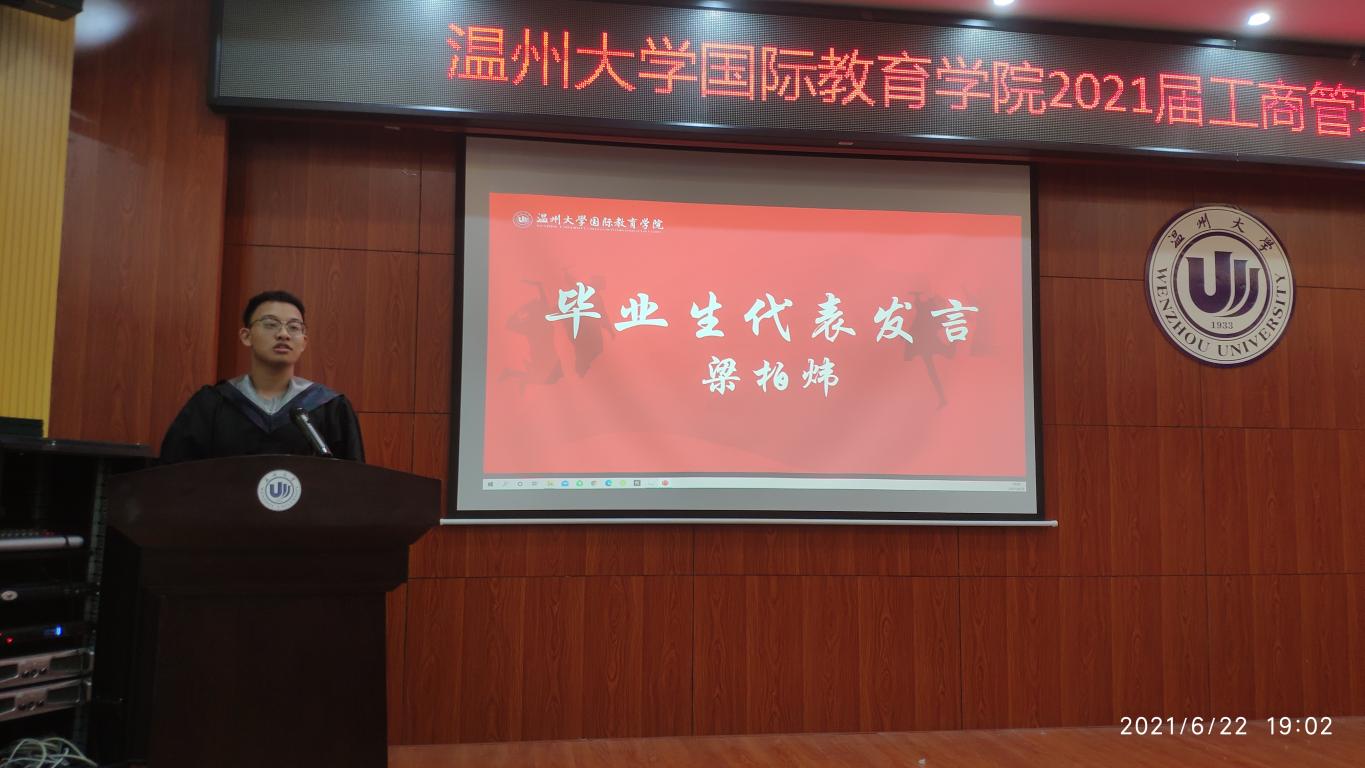 毕业生代表梁柏炜代表全体毕业生再次对辛勤指导的老师们道声感谢与祝福。