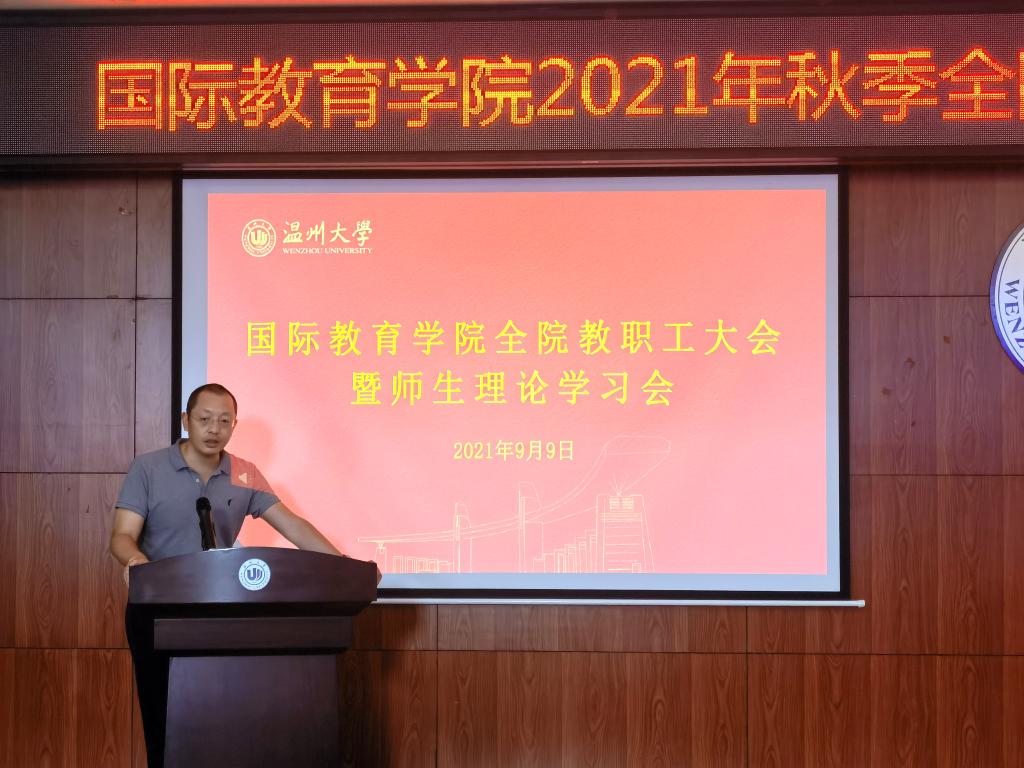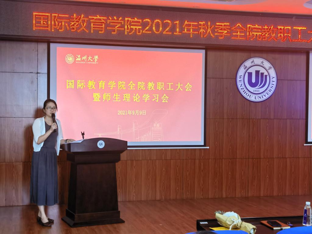 2021/2022第一学期新学期全体教职工大会暨教工理论学习会在国际楼203报告厅召开,会议由党总支书记林爱菊主持。