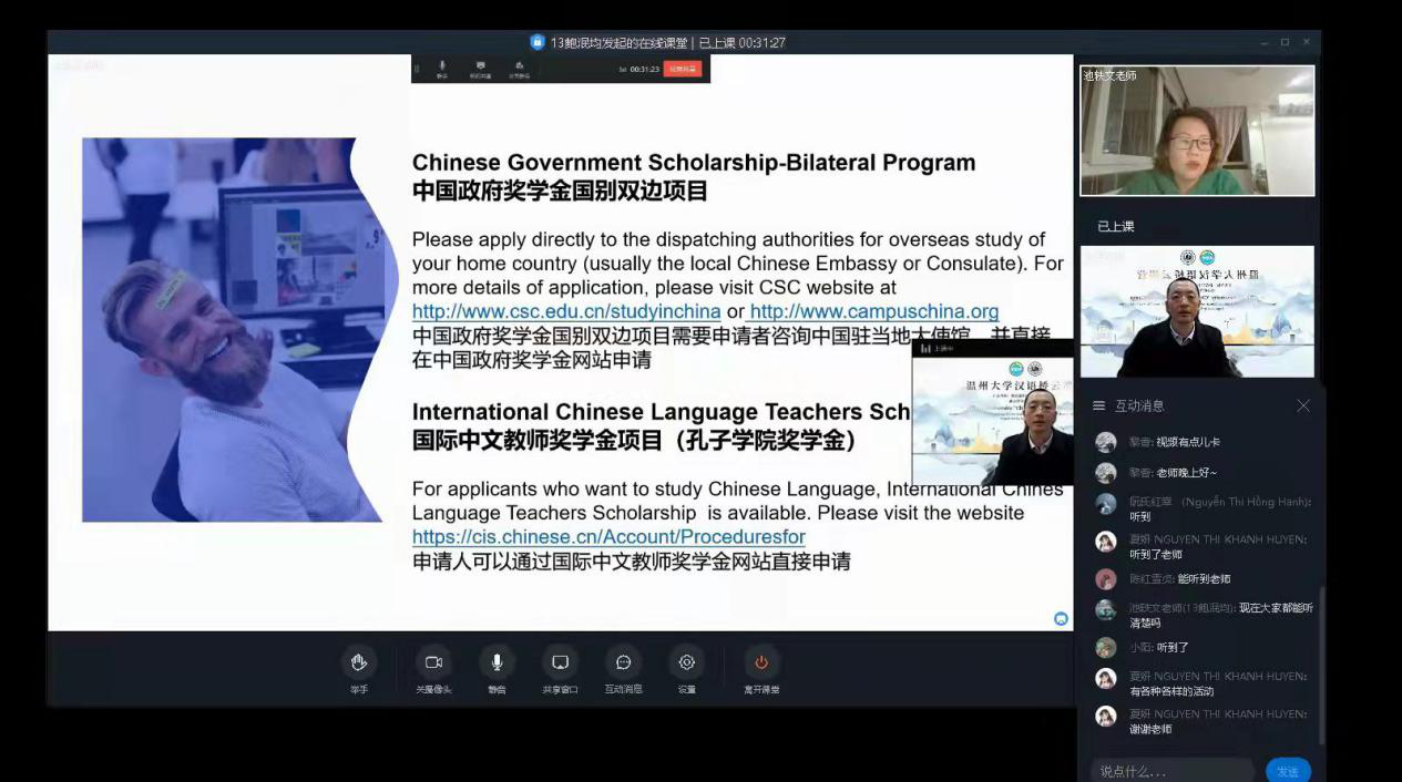 2022秋季入学说明会”在钉钉直播平台顺利举行。本次直播主要面向参加汉语桥的学员,其中以越南籍学生为主。 参加此次我校主办的汉语桥的学员们有着较强的中文基础,因此入学说明会全程使用中文进行宣讲。
