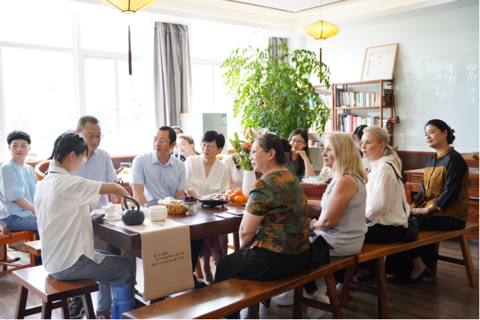会议最后,林爱菊书记代表学院将“茶香国际:中华文化传播基地”的牌子授予了梁旭会长主持的芬兰“中国语言(文化)中心”,并表示未来将持续“以茶为媒”,以中芬茶文化交流为契机,在芬兰中国语言(文化)中心开设文化课程教学以及相关的文化交流活动。