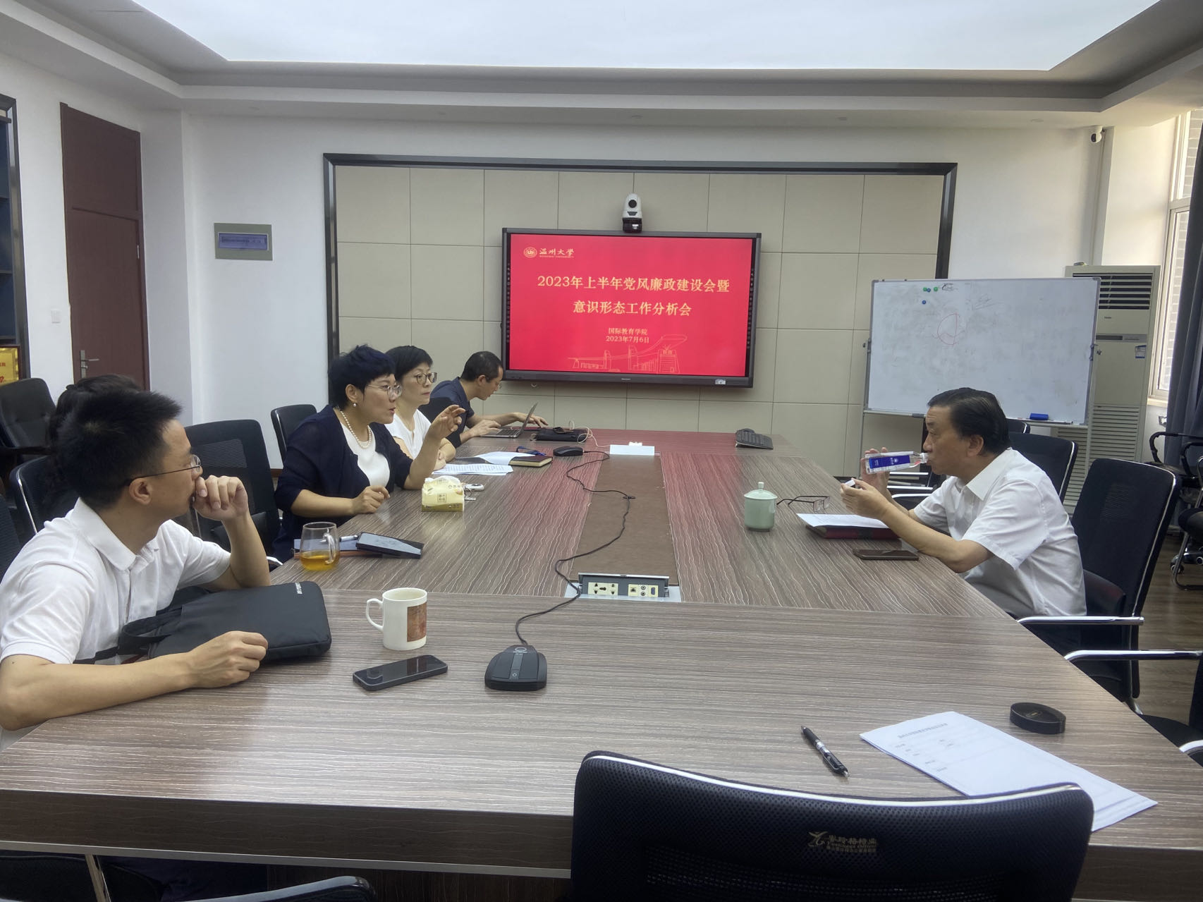 林爱菊书记汇报了学院2023年上半年学院政治生态自查情况以及意识形态工作情况。方建晓副书记汇报了学院2023年上半年党风廉政建设工作情况。班子成员结合各自分管工作就廉政和意识形态“一岗双责”履职情况逐一发言,发言内容涵盖党组织发展、学位点建设、国际生培养、国际生管理等各个方面。