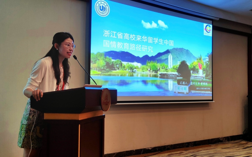 教师黄雅琳以《浙江省高校来华留学生中国国情教育路径研究》为题在分论坛二中做报告,围绕“如何在高校留学生国情教育中凸显浙江特色”、“如何挖掘浙江历史资源中所蕴含的优秀地方文化资源”、“如何向留学生深入阐释浙江精神新时代价值和内涵”、“如何将浙江精神融入留学生国情教育中”等核心问题,提出建构国情叙事理论体系、构筑面向来华留学生的国情育人体系、完善现有课程设置,改进教学模式、加强跨学科协同联动,将研究成果转化为教材、加快建立专业教师队伍,打造来华留学生国情教育共同体、推动国情教育实践基地建设,加速成果产出等。