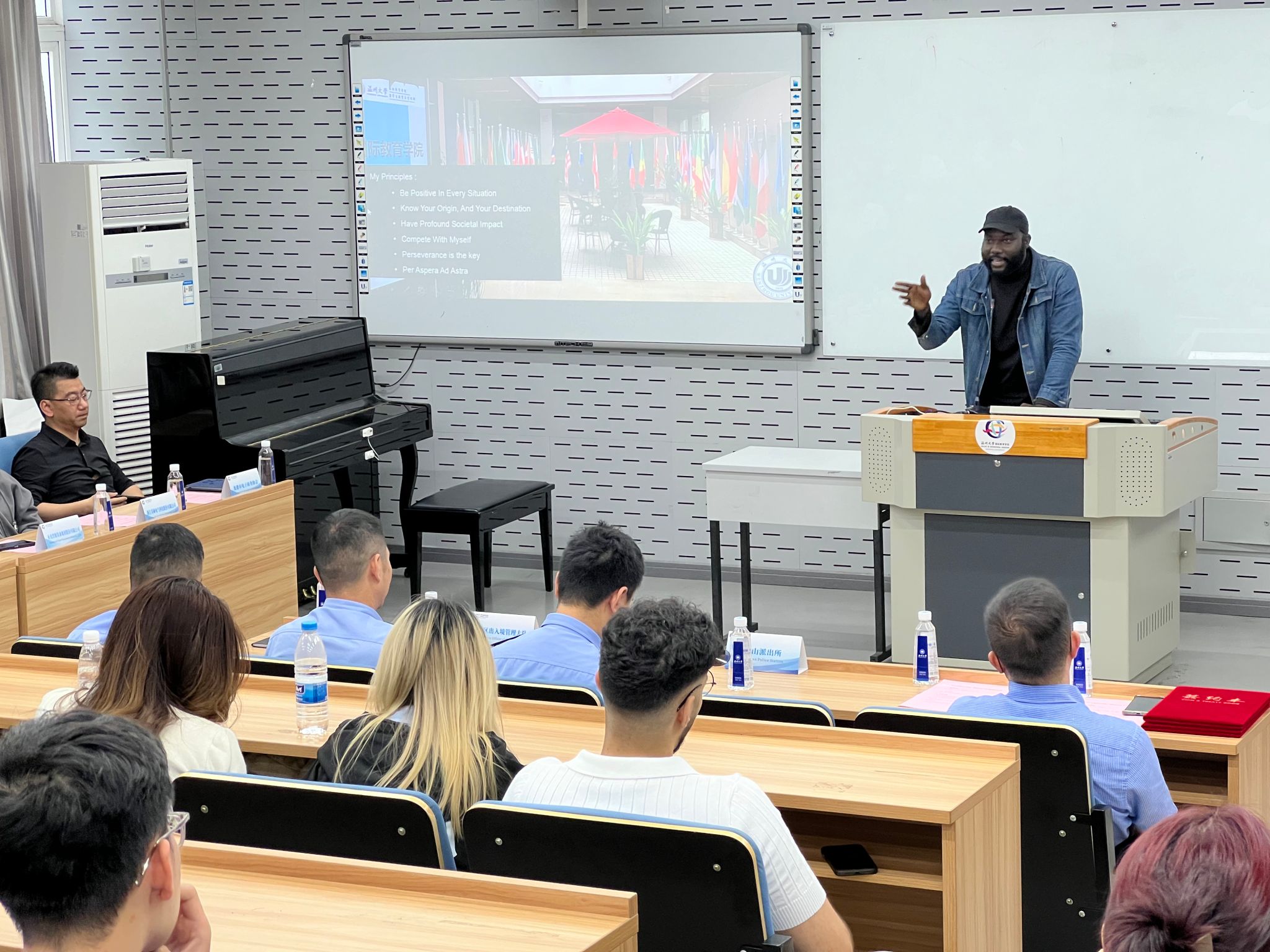 在签约仪式之后,温州市瓯海区出入境和茶山派出所的代表详细介绍了毕业生离校与留温政策。这些政策为留温工作的国际学生提供了便利条件,得到了在场学生的热烈响应。随后,16级硕士毕业生ADOFO MICHAEL ADJEI(洪太阳)分享了他在温学习和工作的经验,鼓励在校国际学生学好汉语、抓住机遇,积极融入。