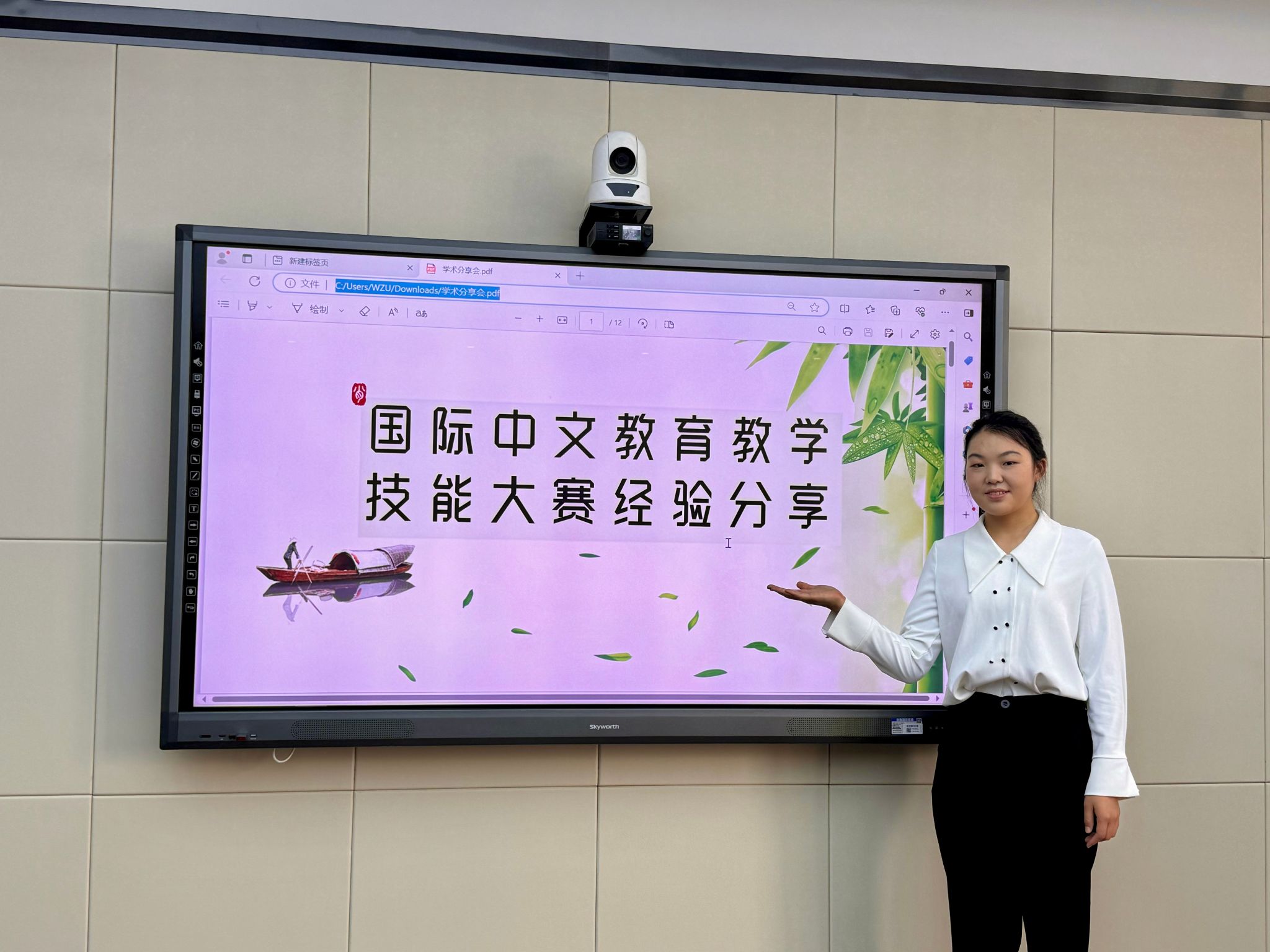 第三位分享者是来自23级汉硕张荣润同学,分享的主题为国际中文教育教学技能大赛经验分享。张荣润同学热情洋溢地讲述了自己参与大赛的全过程,从赛前的精心准备,包括教学内容的设计、教学方法的选择,到赛中的精彩展示与应对,以及赛后的总结与反思。他的分享生动有趣且极具实用性,让同学们对教学技能大赛有了更深入的了解,对提升自己的教学技能有了明确的方向和目标。