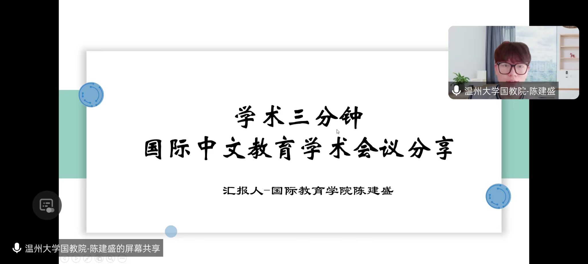 第二位分享者是23级汉硕陈建盛同学,分享的主题为国际中文教育学术会议分享。陈建盛同学从会议流程、参会经验、会议选择等多个方面具体详细地介绍了国际中文教育会议情况,还有在会议中接触到的前沿思想和创新理念以及与众多优秀学者交流所获得的启发。他的讲述精彩纷呈,让大家对国际中文教育领域的发展动态有了更直观的了解,进一步激发了大家对参与国际学术交流的向往和热情。