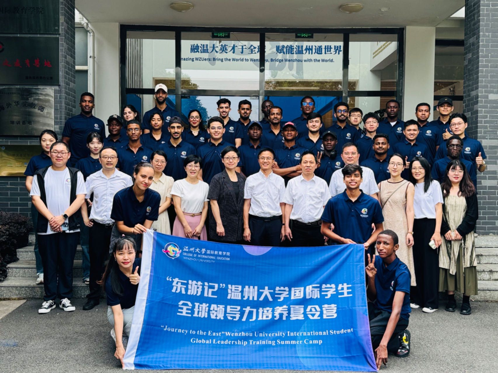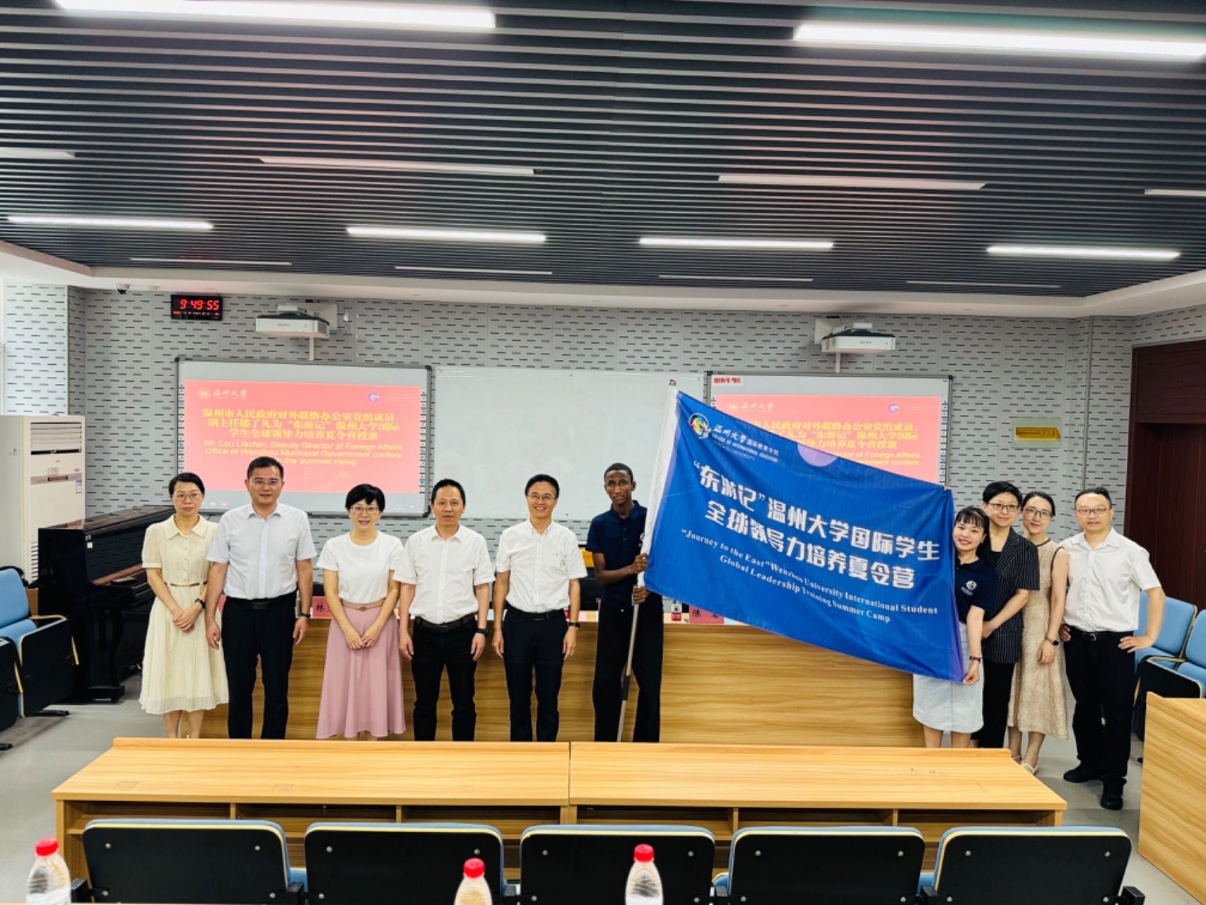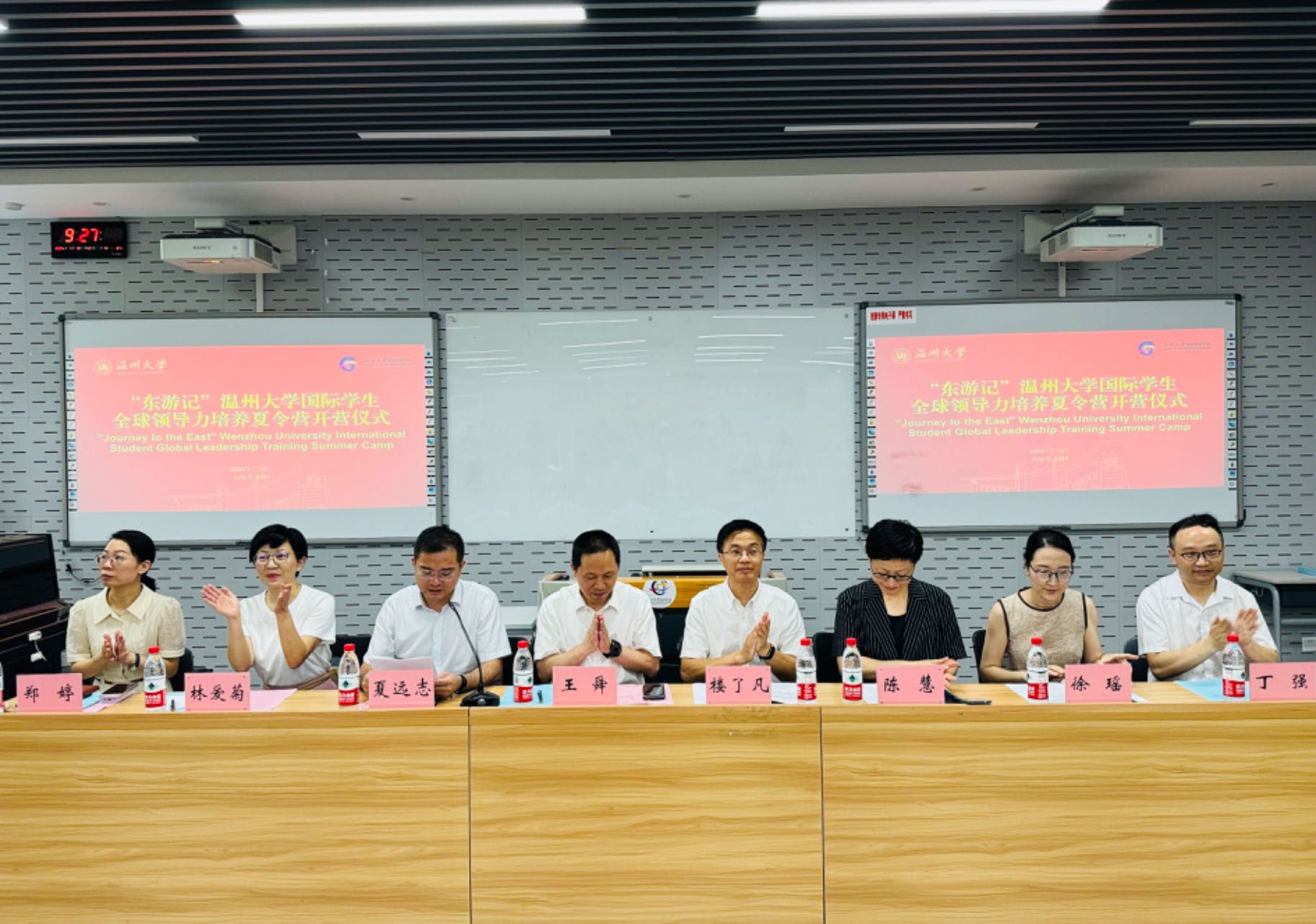 国际学生全球领导力培养夏令营开营仪式。温州市人民政府对外联络办公室党组成员、副主任楼了凡,校党委委员、副校长王舜,校国际处处长陈慧,校团委副书记徐瑶,海角视频