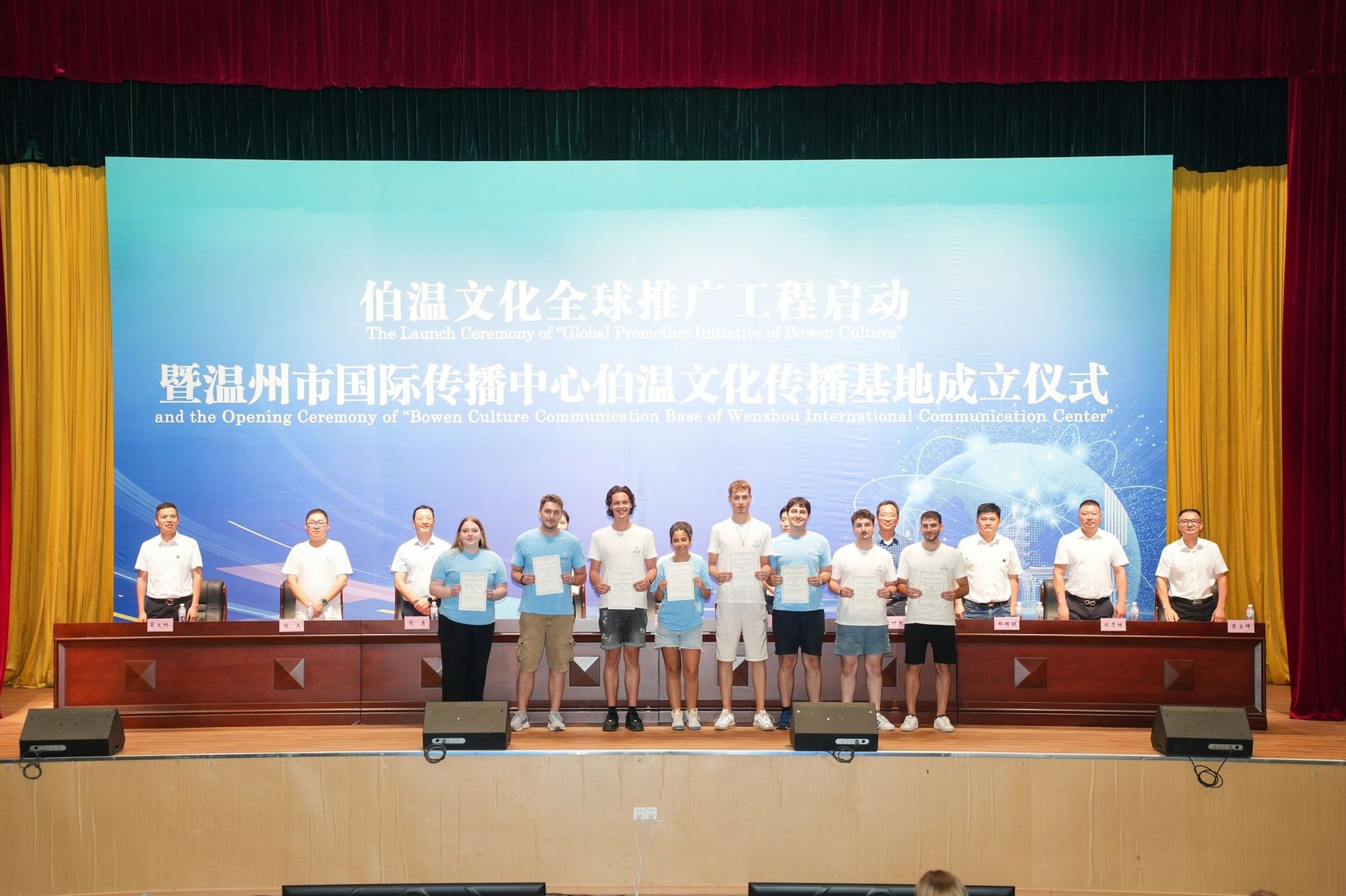 随后,学生们参加了“伯温文化全球推广工程启动暨温州市国际传播中心伯温文化传播基地成立仪式”。学生们通过纪录片进一步学习了伯温文化与历史,深入了解了这位历史名人的生平事迹与文化遗产。仪式上,来自德国、波兰、罗马尼亚、突尼斯、俄罗斯、土耳其、拉脱维亚、保加利亚8个国家的学生代表被聘为伯温文化传播使者。最后学生们沉浸式体验中国舞龙,感受中国传统文化的魅力。