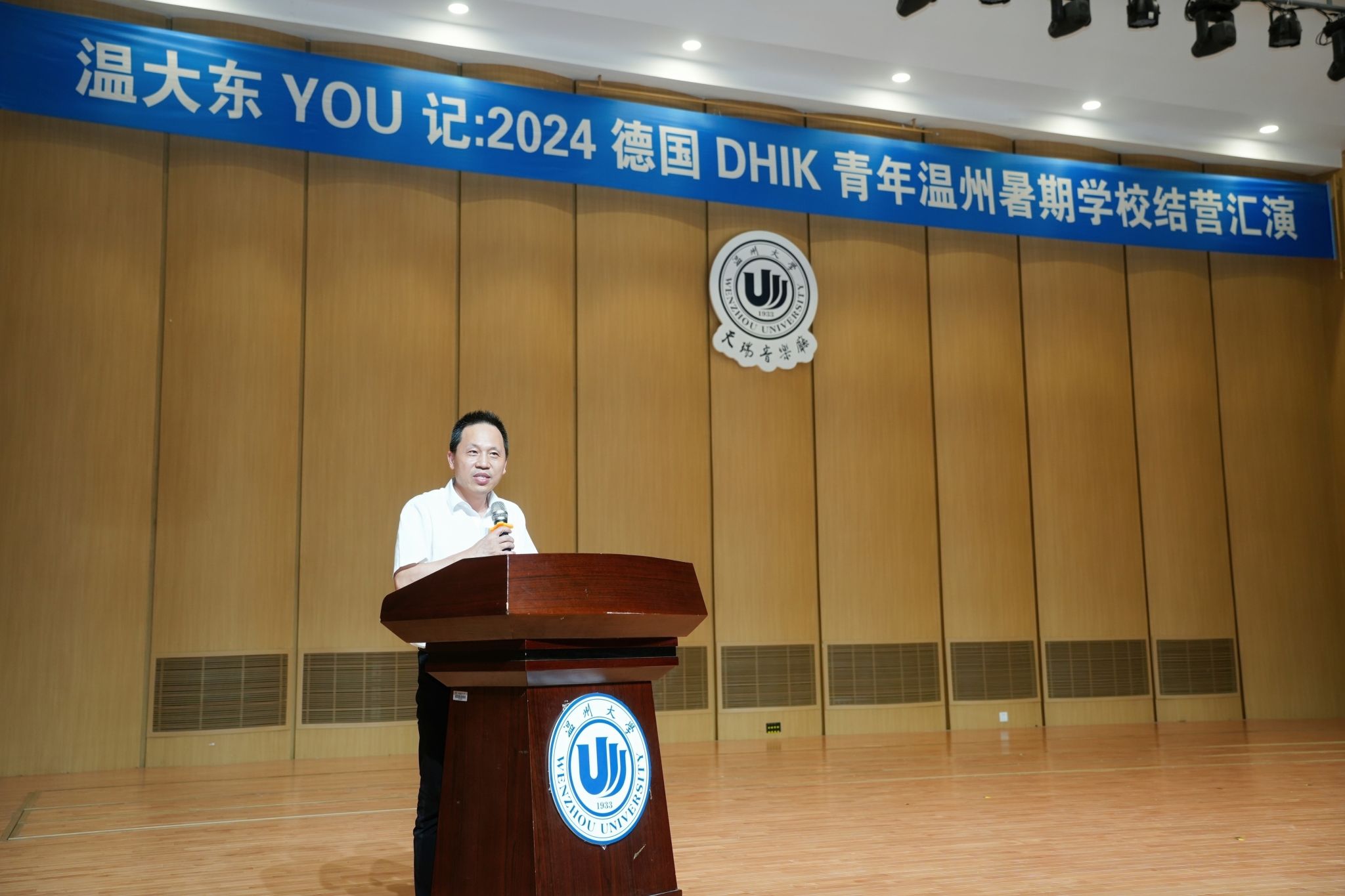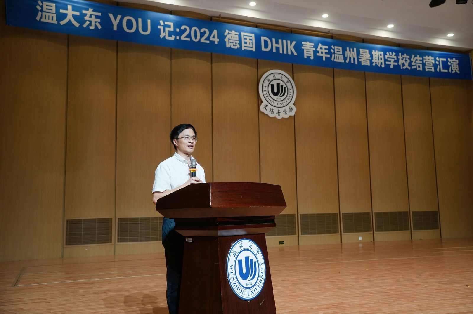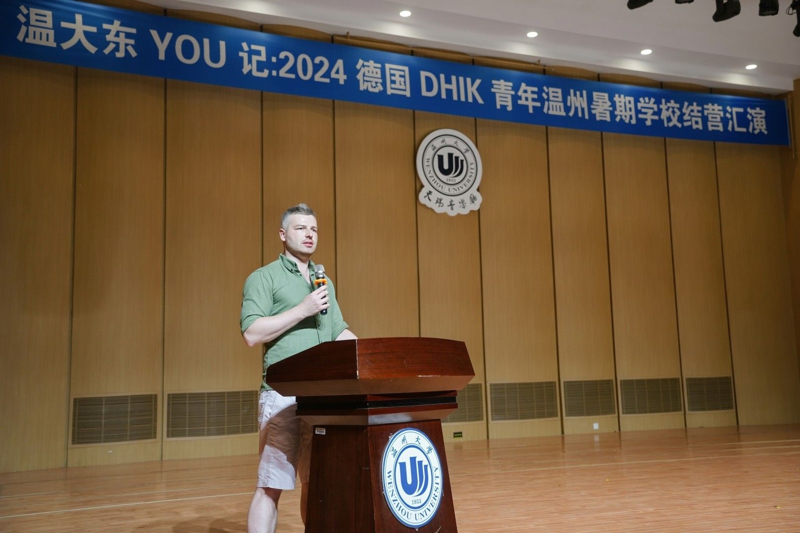 副校长王舜首先致辞,对德国青年学子们在暑期学校的精彩表现给予了高度评价,并对中德文化交流的广阔未来充满期待。温州市外事办副主任楼了凡随后发表讲话,强调了此次活动对促进两校友好关系的重要意义。德方院长Oliver也在致辞中表达了对温州的诚挚感谢以及对未来继续合作的美好展望。德国青年学生代表Knud Hano的讲话则充满了对这段难忘经历的深刻感慨和对中德友谊的珍视之情。随后,王舜副校长向本次暑期学校的带队老师赠送纪念品,以表达对他们辛勤付出的崇高敬意。