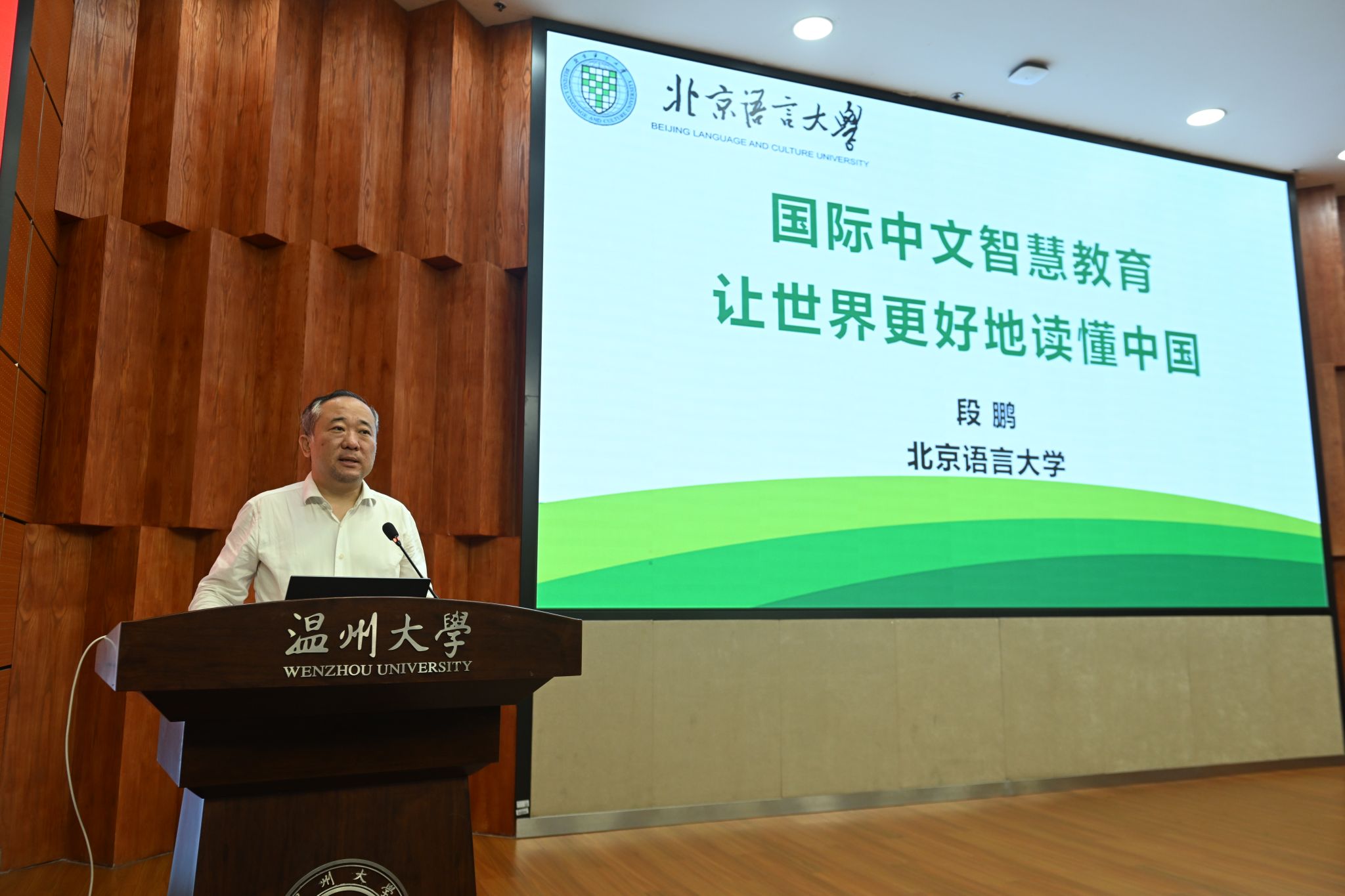 主旨报告环节,段鹏教授以《国际中文智慧教育,让世界更好地读懂中国》为题,结合国际中文智慧教育转型升级的综合实践,分享了北京语言大学在开辟智慧教育方向、实施智慧教育工程、研发智慧教学系统、开展智慧课程建设等方面的创新探索。他介绍,“理解当代中国”智慧课程能够有效构建和分析学习者画像,并利用大模型自动生成教学拓展资源,具有教学流程规范性和团队组建开放性等特点。他表示,未来学校将全面开放智慧教学系统和“理解当代中国”智慧课程,愿与学界业界同仁携手共进,以国际中文教育为桥,让世界各国人民更好地读懂中国、理解中国、认同中国。