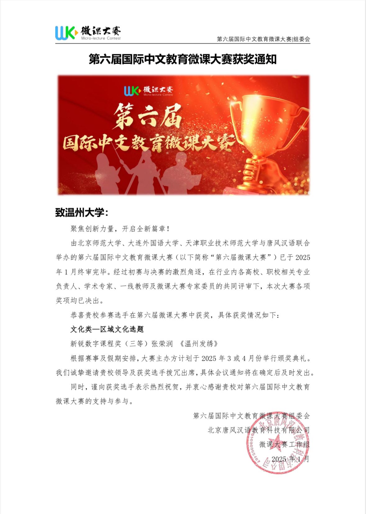 近日,由北京师范大学、大连外国语大学、天津职业技术师范大学与唐风汉语联合主办的第六届国际中文教育微课大赛圆满落幕。本届大赛吸引了来自全国240余位个人选手及120余个团体(含近700名成员)参与,提交作品逾1300件,涵盖语言教学、区域文化、中国国情等多元主题。海角视频 2023级研究生张荣润凭借扎实的专业知识、创新的教学理念和出色的教学技能在比赛中荣获“新锐数字课程奖(三等)”。