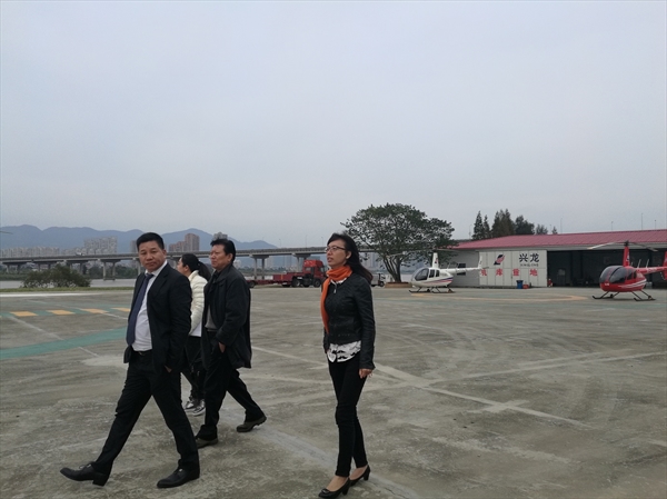 在李兴猛的陪同下,包含丽一行参观了坐落在江心屿西园的直升机起降点和兴龙航空的各运营部门。在随后召开的调研座谈会上,李兴猛详细介绍了兴龙航空公司目前主要经营的通航业务、公司人员结构及人才引进情况等。