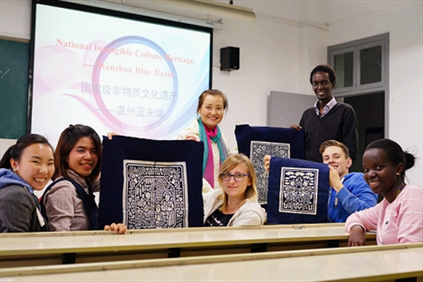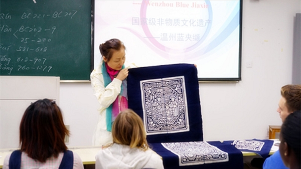 国际合作学院张丽丽副教授给留学生开设了温州蓝夹缬的专题讲座,从历史渊源、文化象征、染布技艺等多方面介绍了蓝夹缬,让留学生们对这一古老的中国印染技艺有了初步的认识。