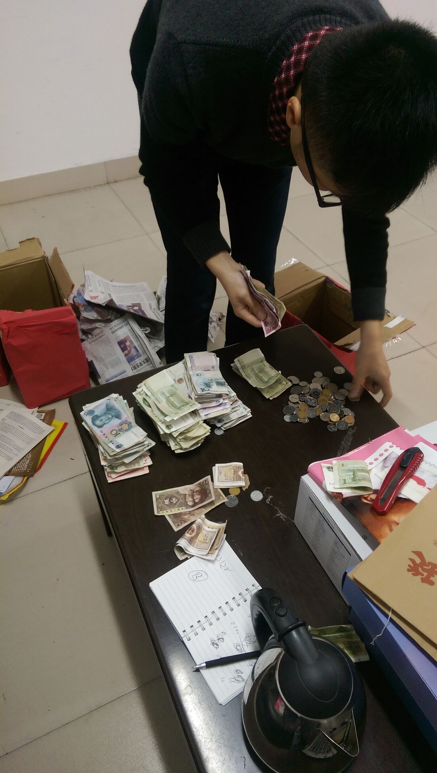 图为志愿者在老师的公证下清点善款 徐崇洁摄