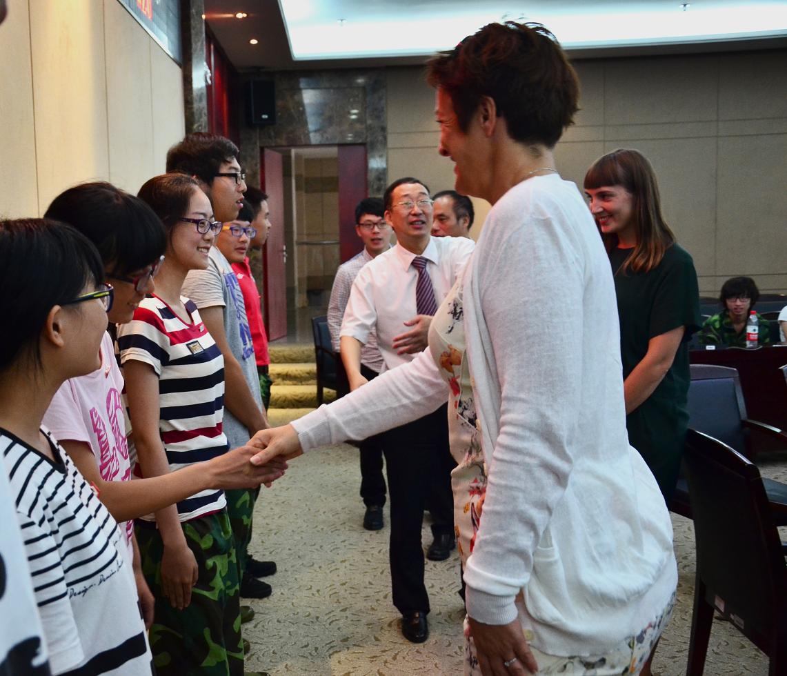 图为安雅校长与学生亲切握手